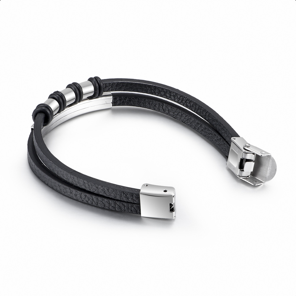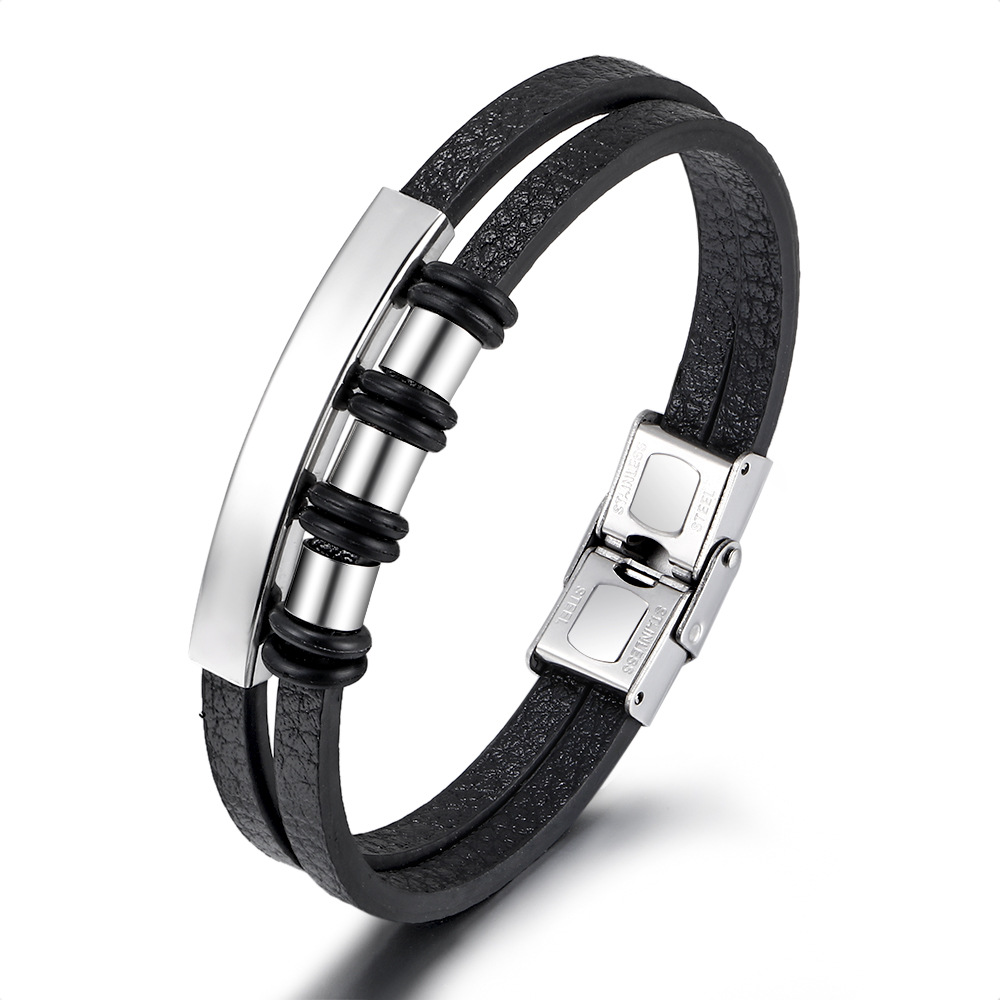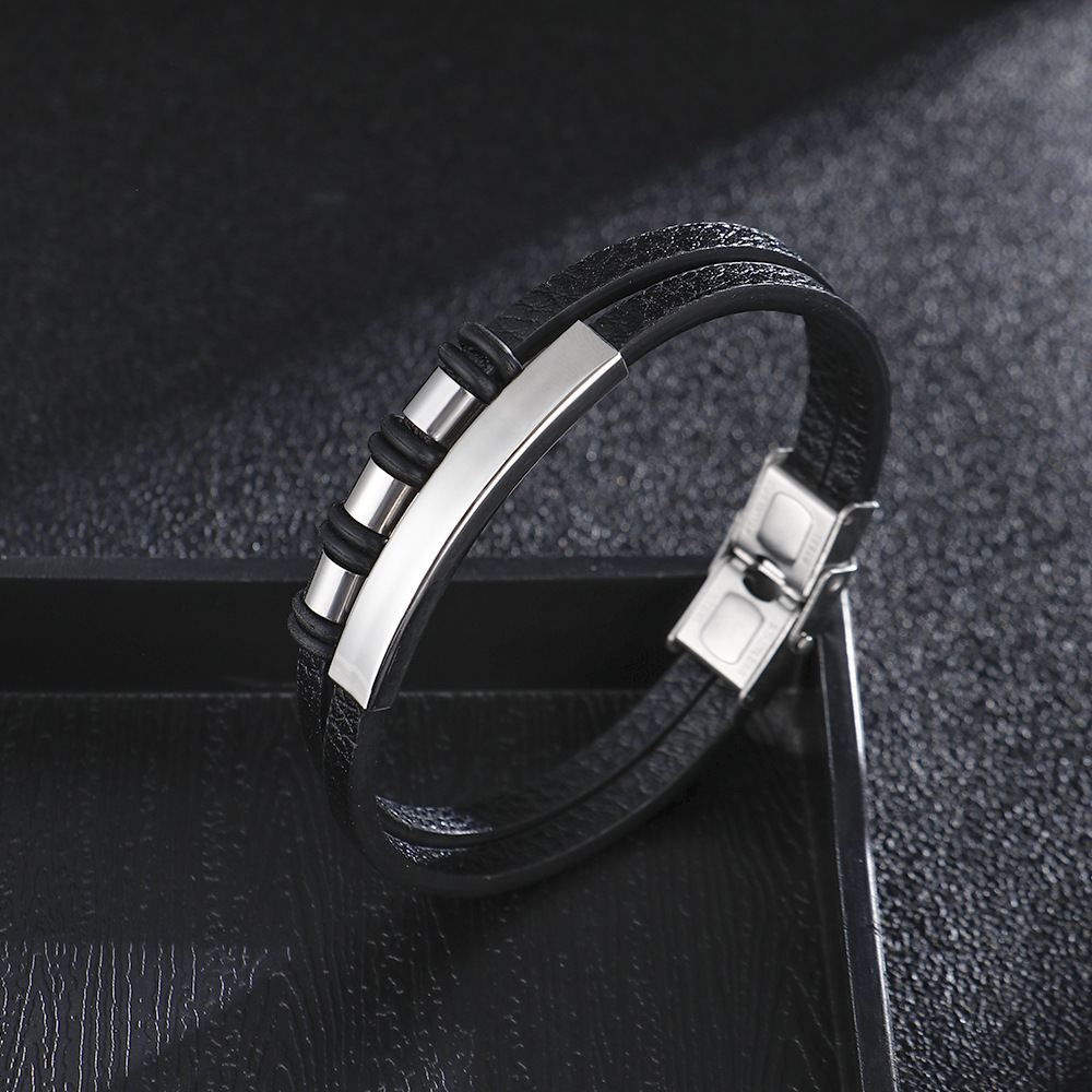Çift Katmanlı Siyah Deri Gümüş Renk Çelik Plaka Kilit Sistemli İsme Özel Harf Yazılı Erkek Bileklik - 1