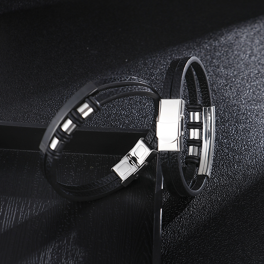 Çift Katmanlı Siyah Deri ve Siyah Çelik Plaka Kilit Sistemli İsme Özel Harf Yazılı Erkek Bileklik - 1