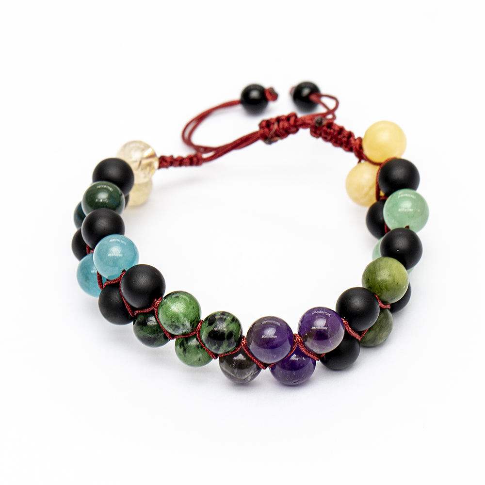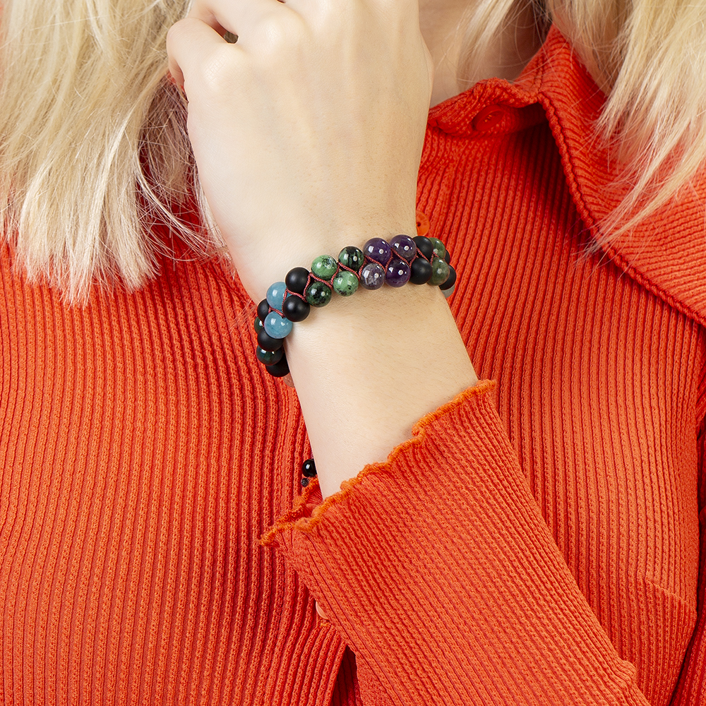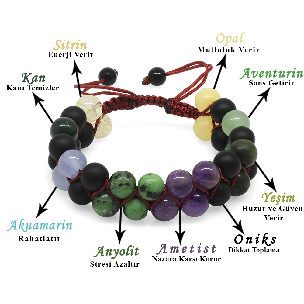 Çift Sıra Makrome Örgülü Küre Kesim Çoklu Doğaltaş Kombinli Kadın Şifa Bilekliği