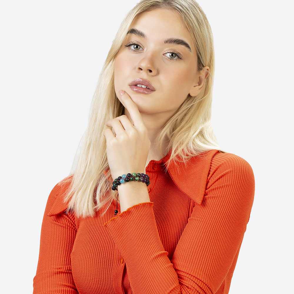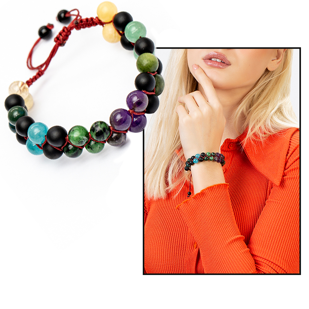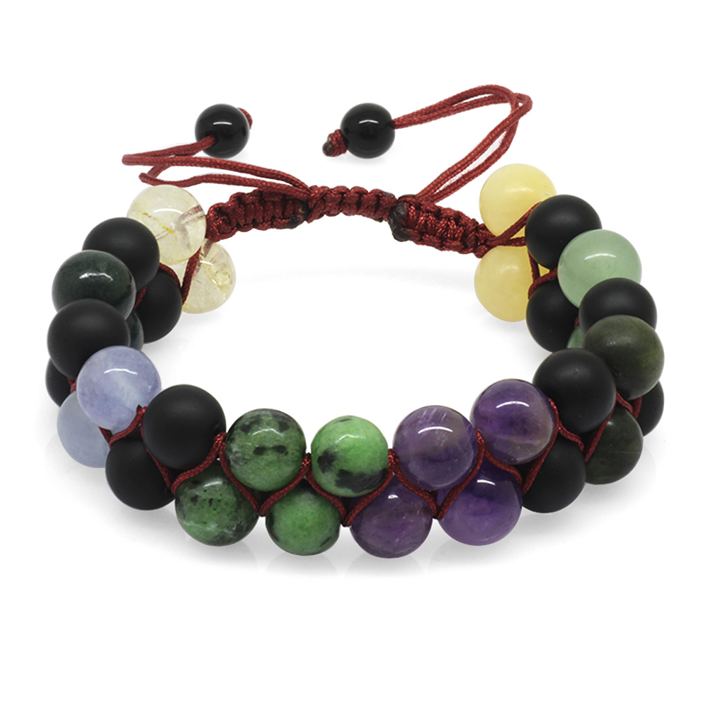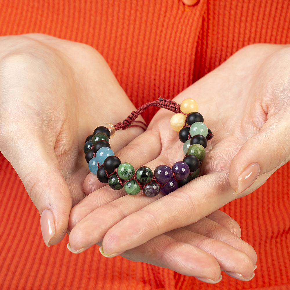 Çift Sıra Makrome Örgülü Küre Kesim Çoklu Doğaltaş Kombinli Kadın Şifa Bilekliği