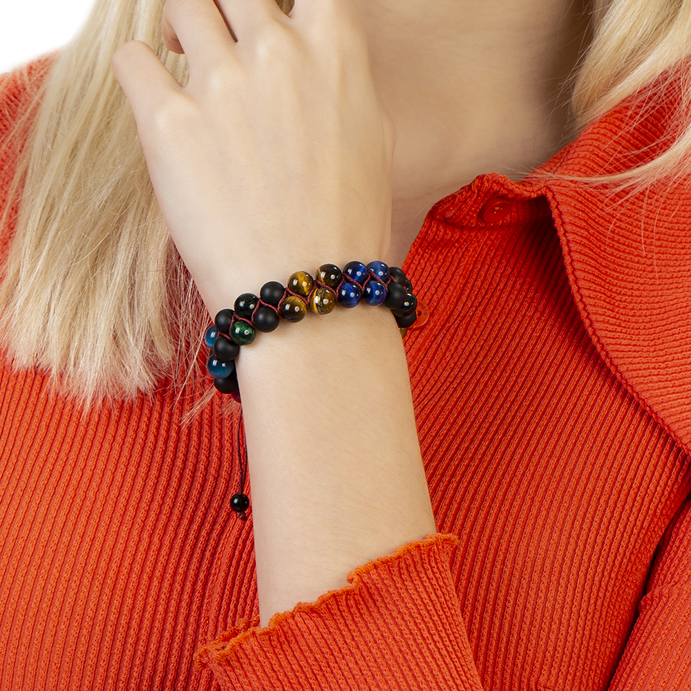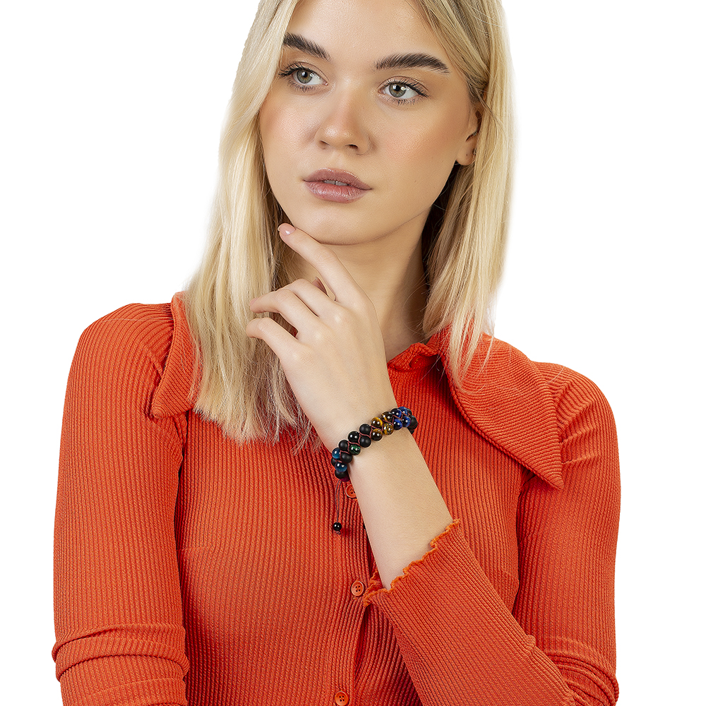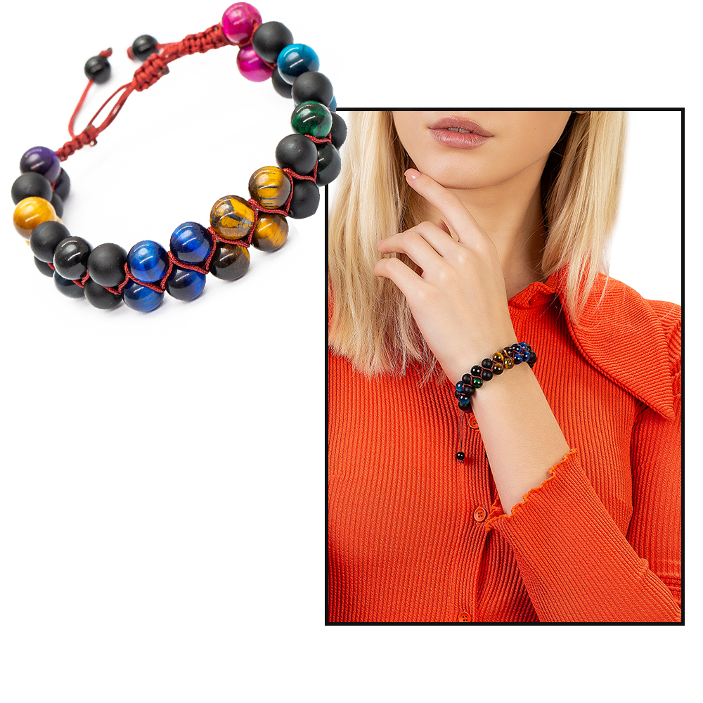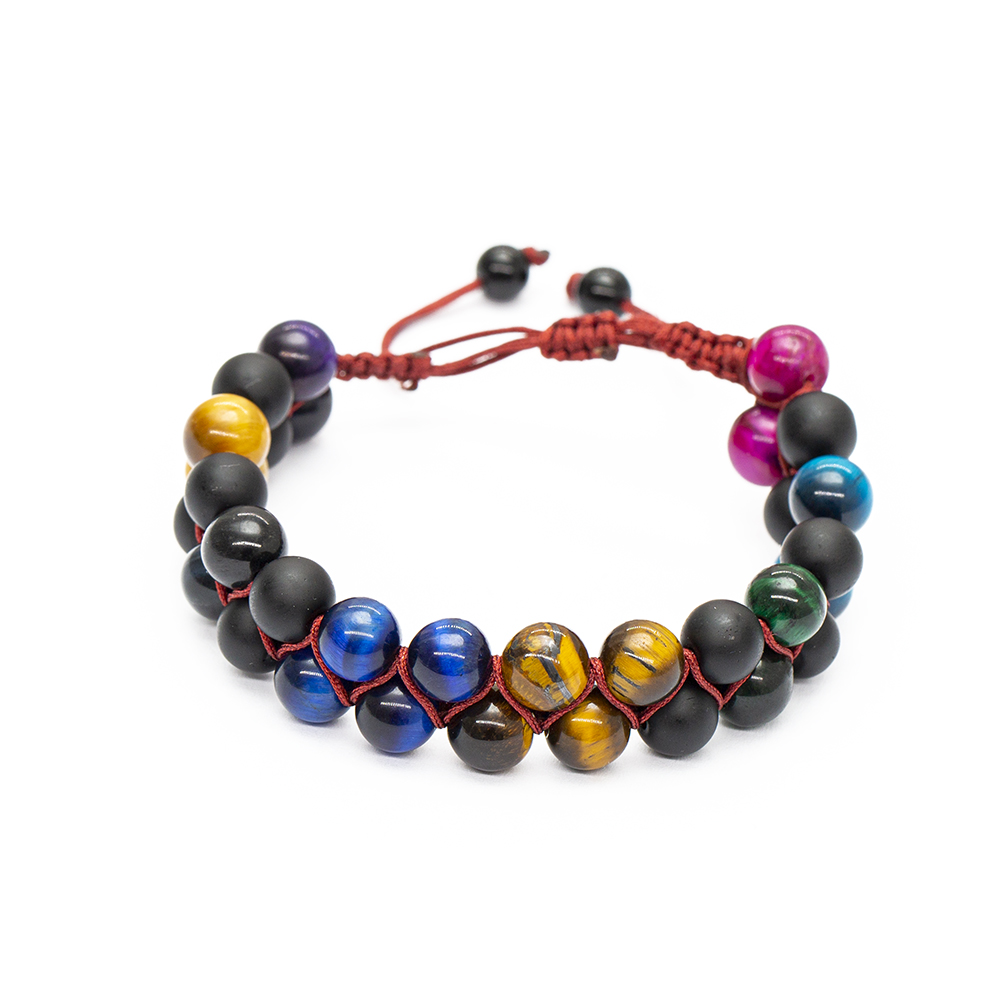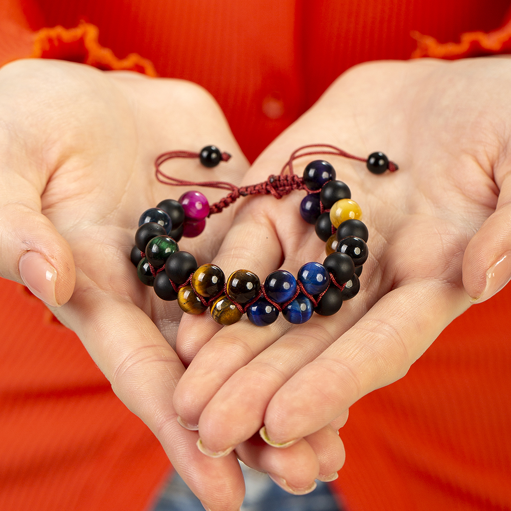 Çift Sıra Makrome Örgülü Küre Kesim Çoklu Kaplan Gözü Doğaltaş Kombinli Kadın Enerji Bilekliği
