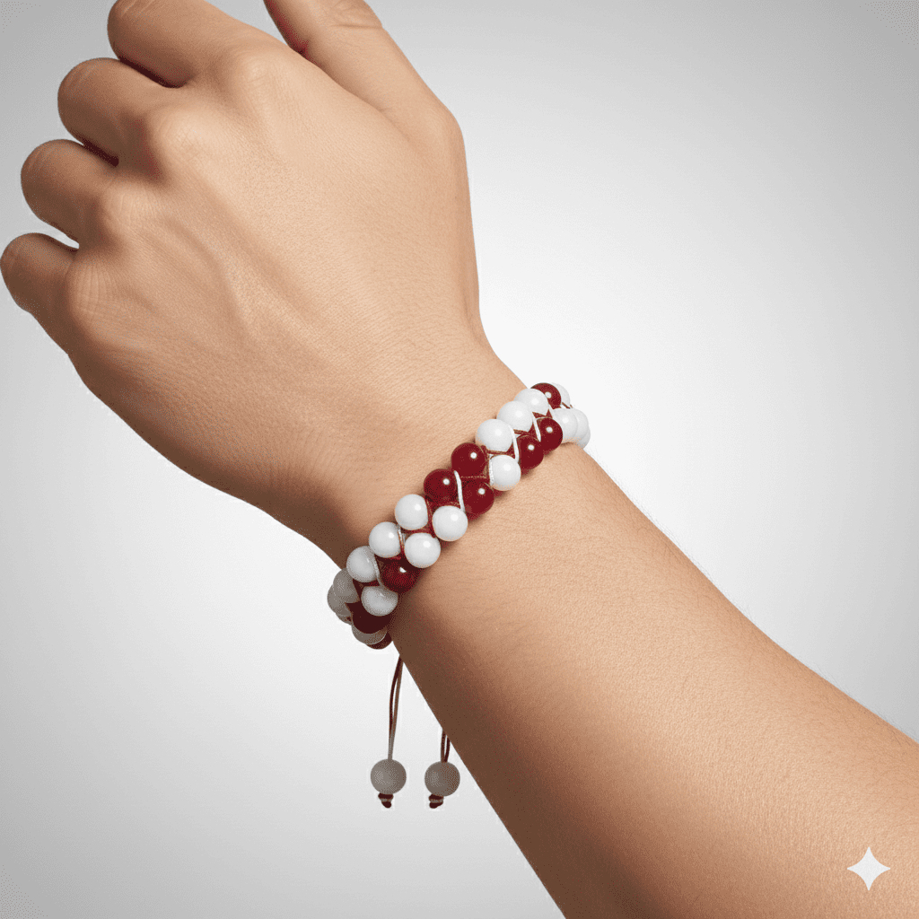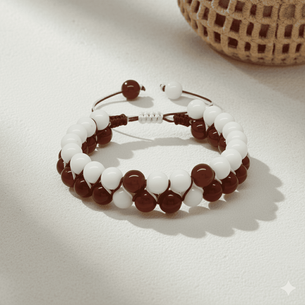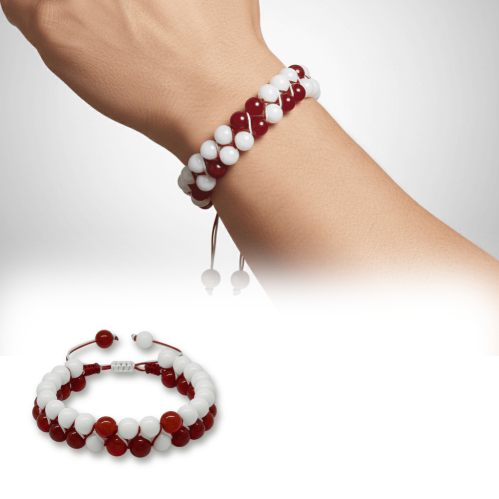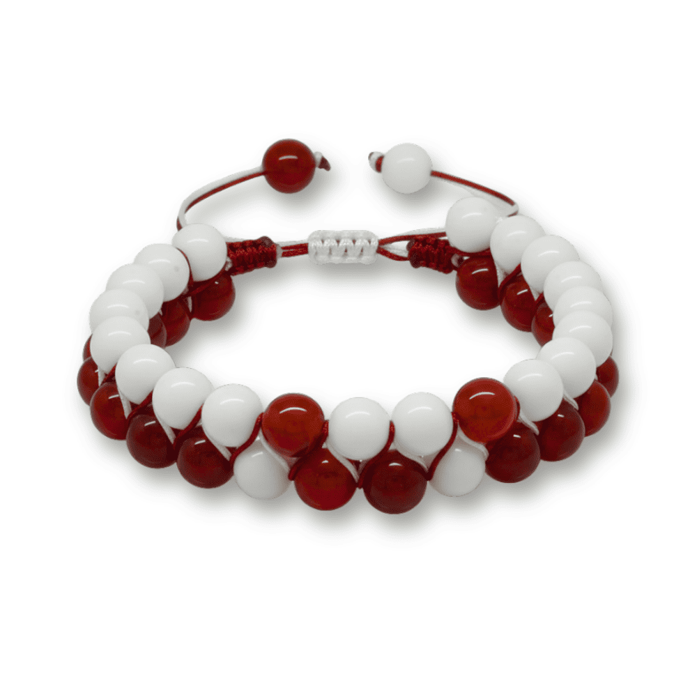 Çift Sıra Makrome Örgülü Küre Kesim Kırmızı Beyaz Jade Akik Doğaltaş Erkek Taraftar Bileklik