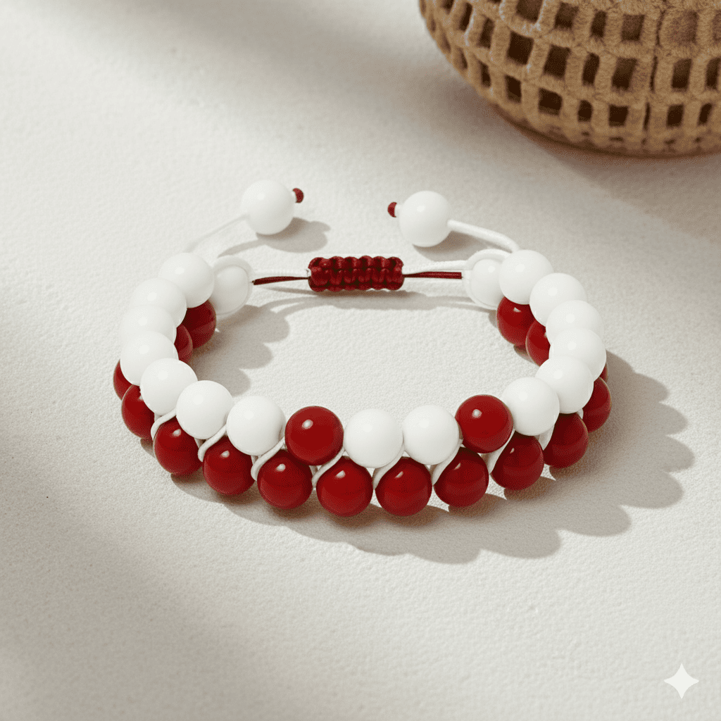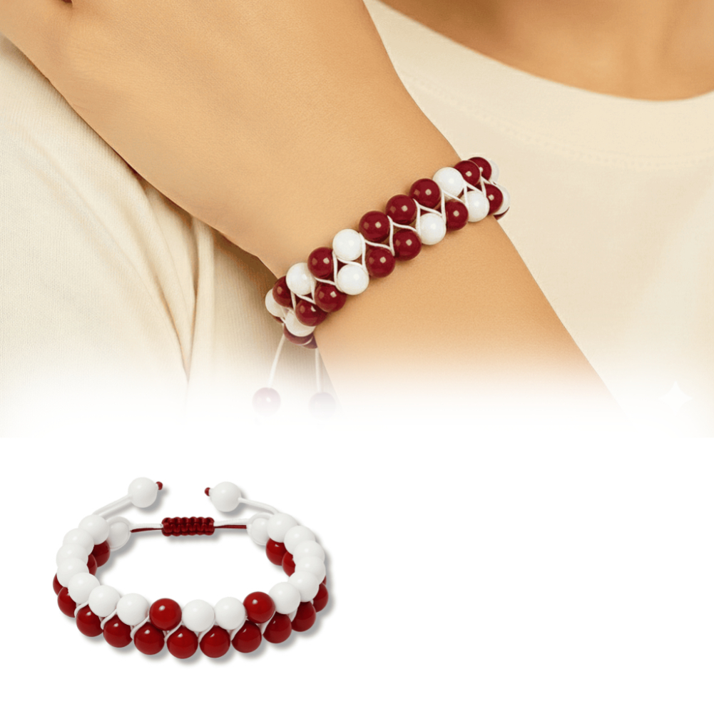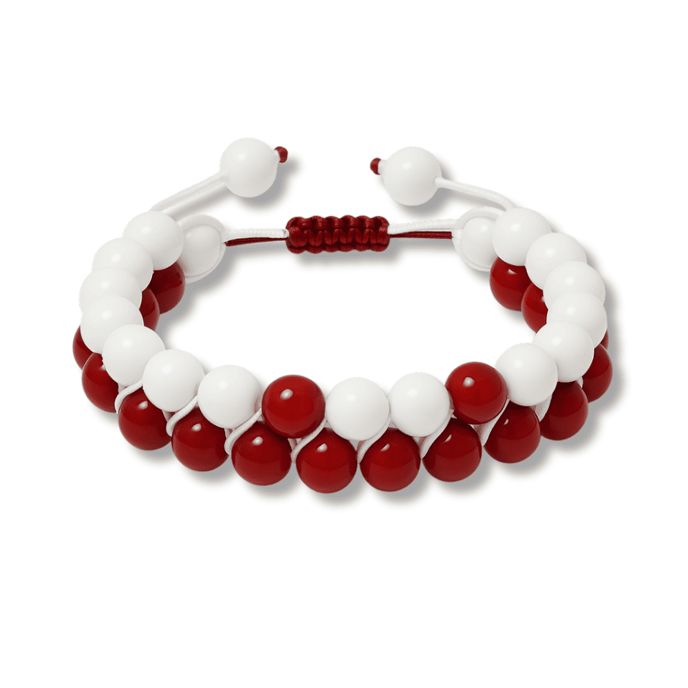 Çift Sıra Makrome Örgülü Küre Kesim Kırmızı Beyaz Jade Akik Doğaltaş Kadın Taraftar Bileklik