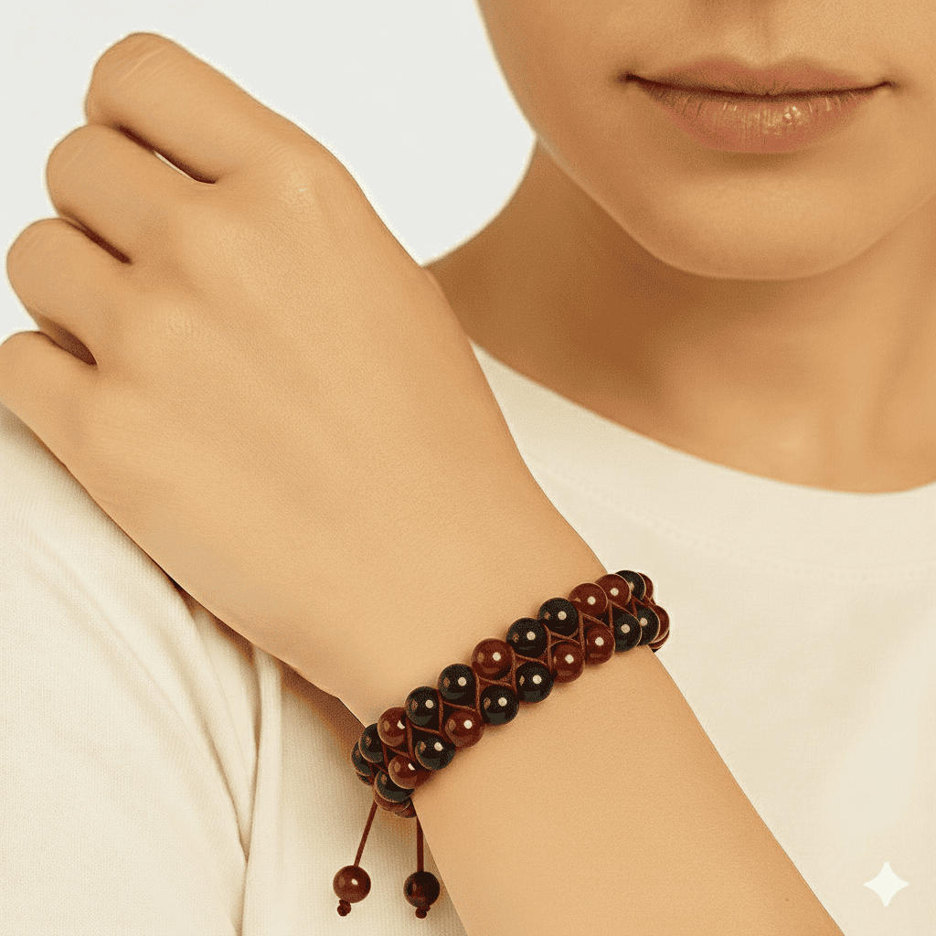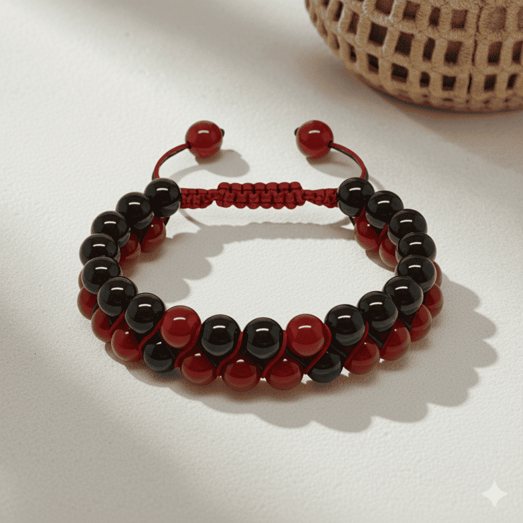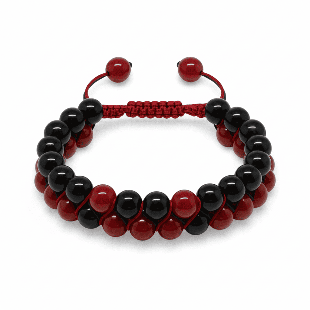 Çift Sıra Makrome Örgülü Küre Kesim Kırmızı Siyah Akik Oniks Doğaltaş Kadın Taraftar Bileklik