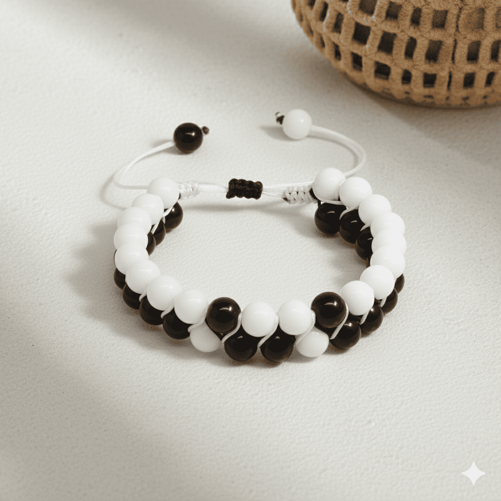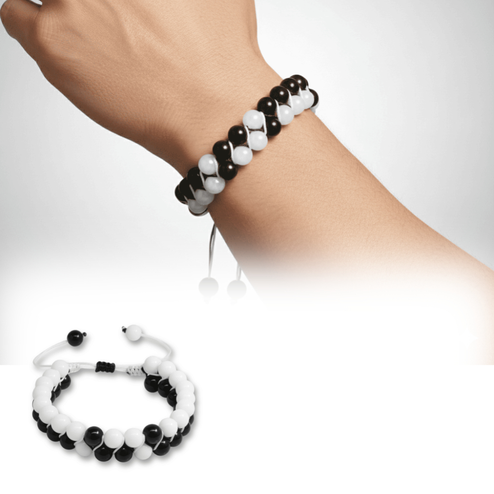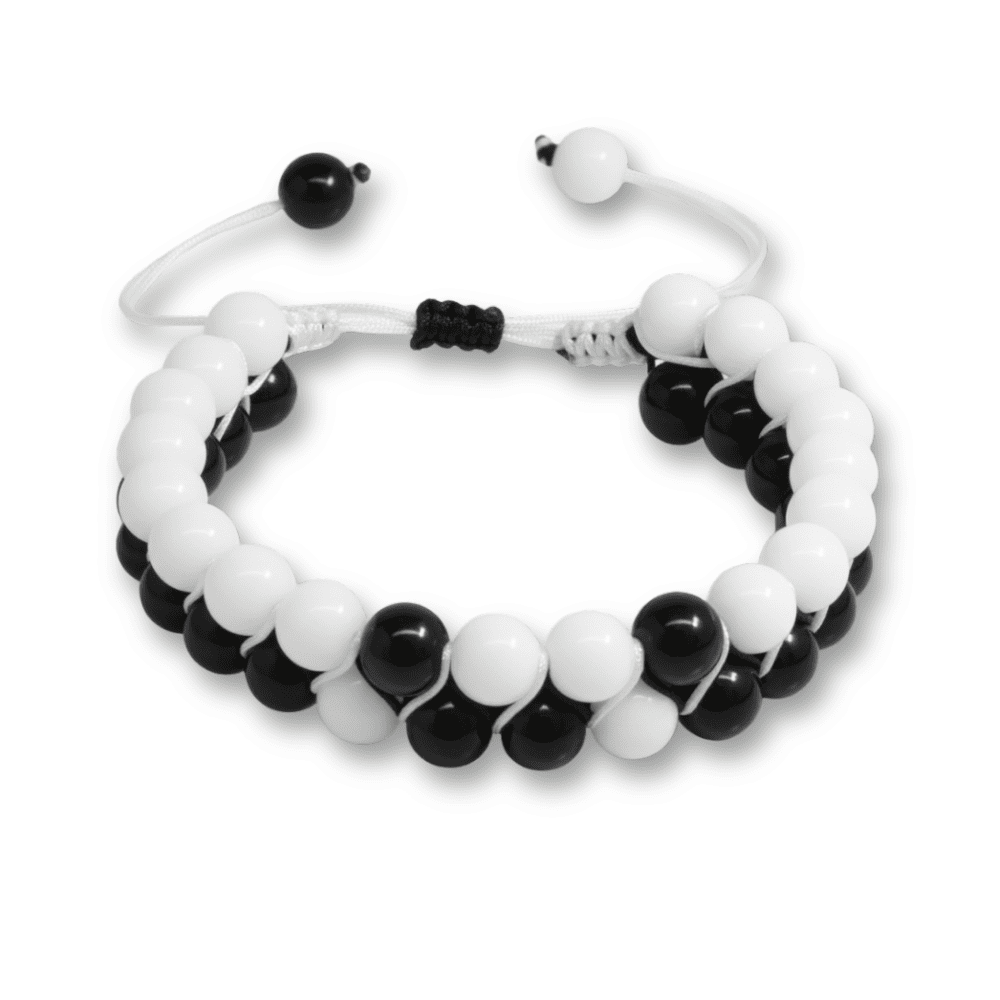 Çift Sıra Makrome Örgülü Küre Kesim Siyah Beyaz Jade Oniks Doğaltaş Erkek Taraftar Bileklik