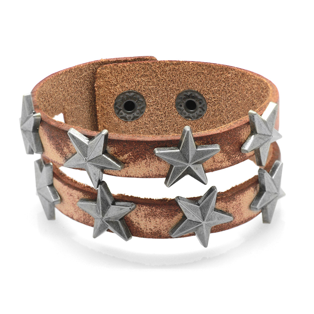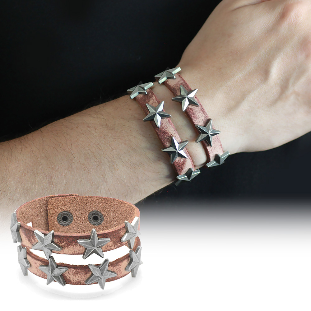 Çift Sıra Yıldız Tasarım Geniş Model Deri Erkek Bileklik - 1