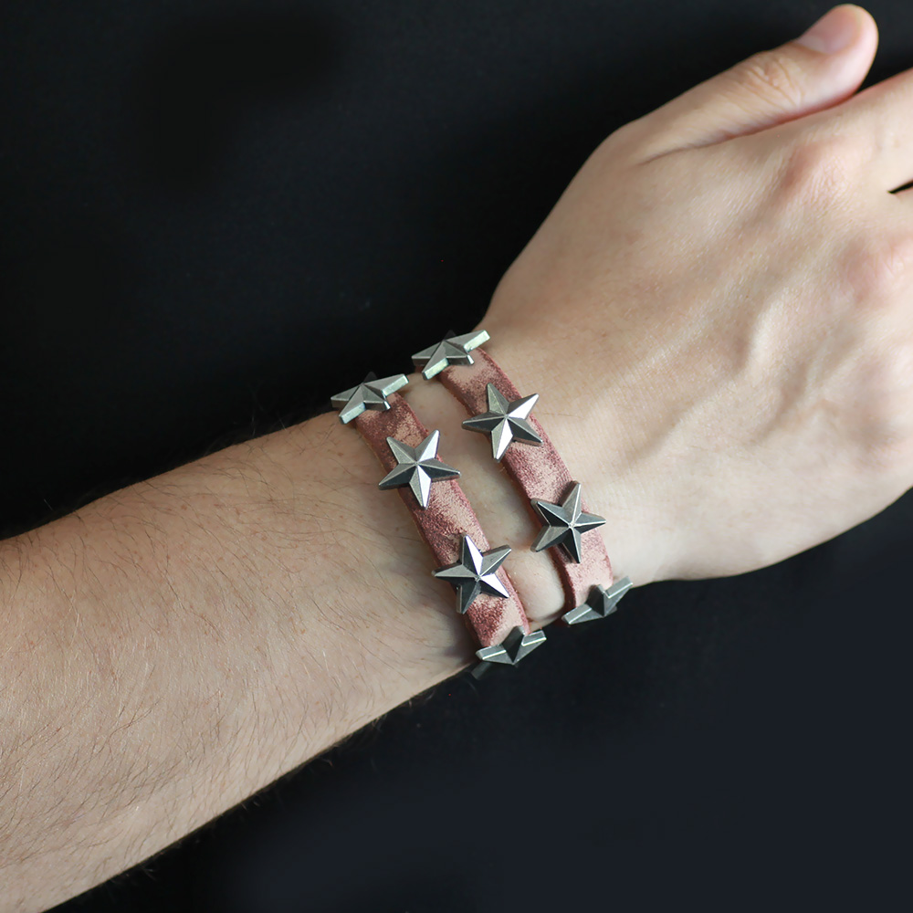 Çift Sıra Yıldız Tasarım Geniş Model Deri Erkek Bileklik