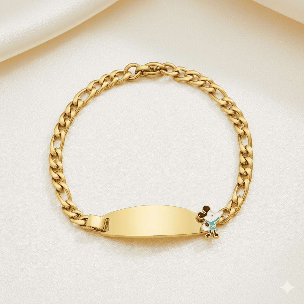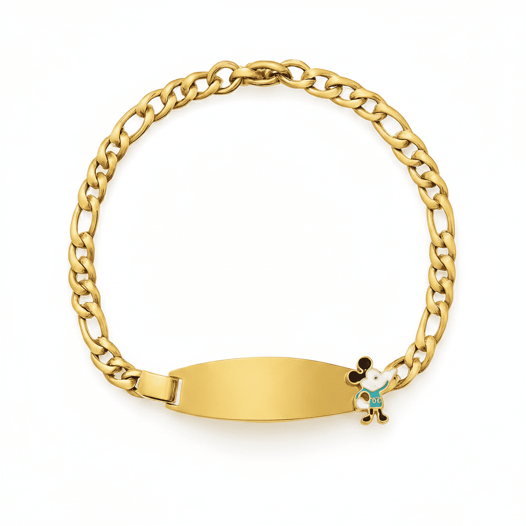 Çocuk Çelik Bileklik - İsme Özel Yazılı - Altın Renk - Mickey Mouse Figürlü - Figaro Zincirli