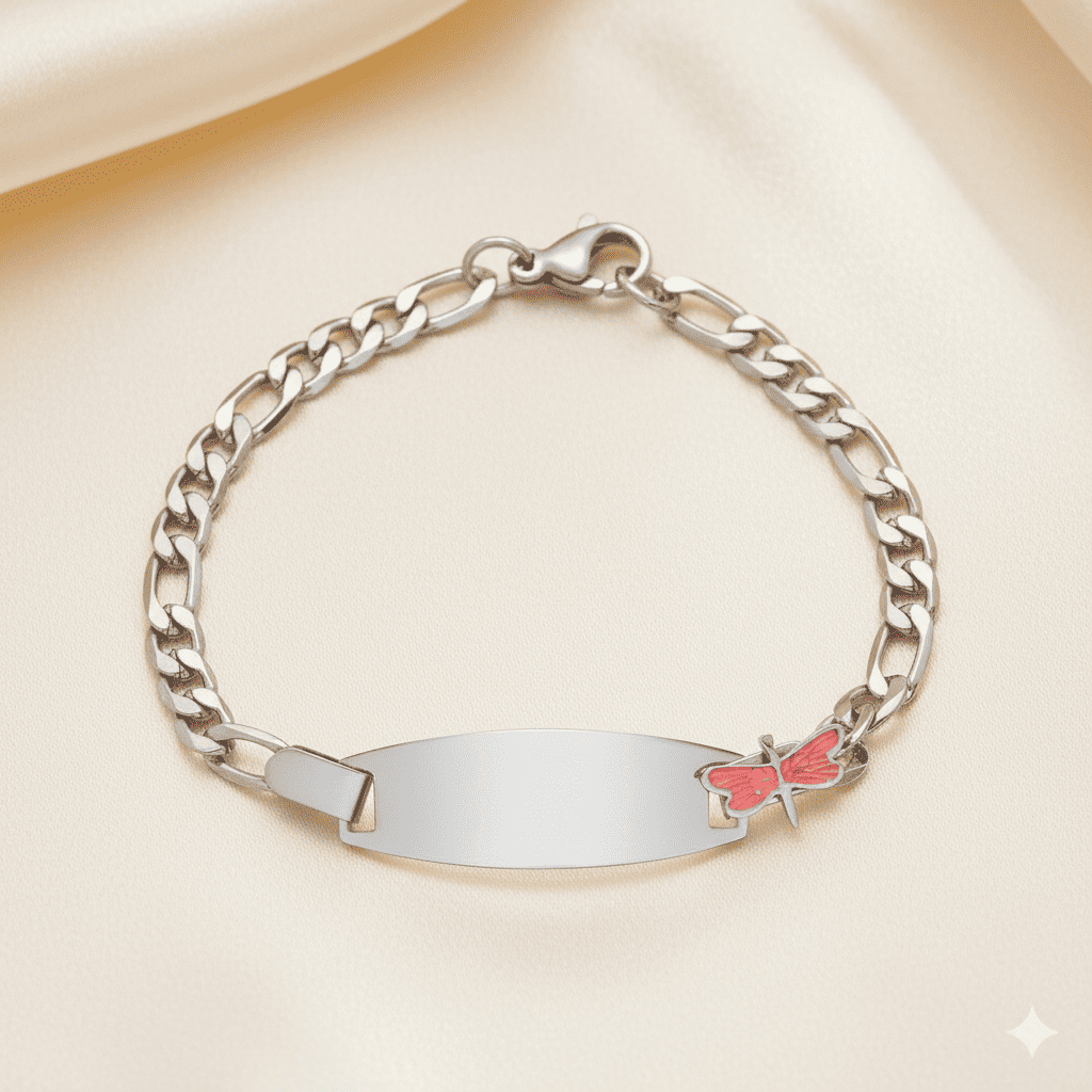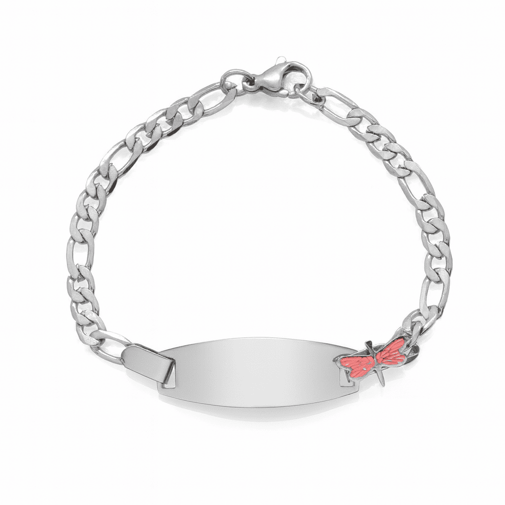 Çocuk Çelik Bileklik - İsme Özel Yazılı - Gümüş Renk - Pembe Yusufcuk Figürlü - Figaro Zincirli