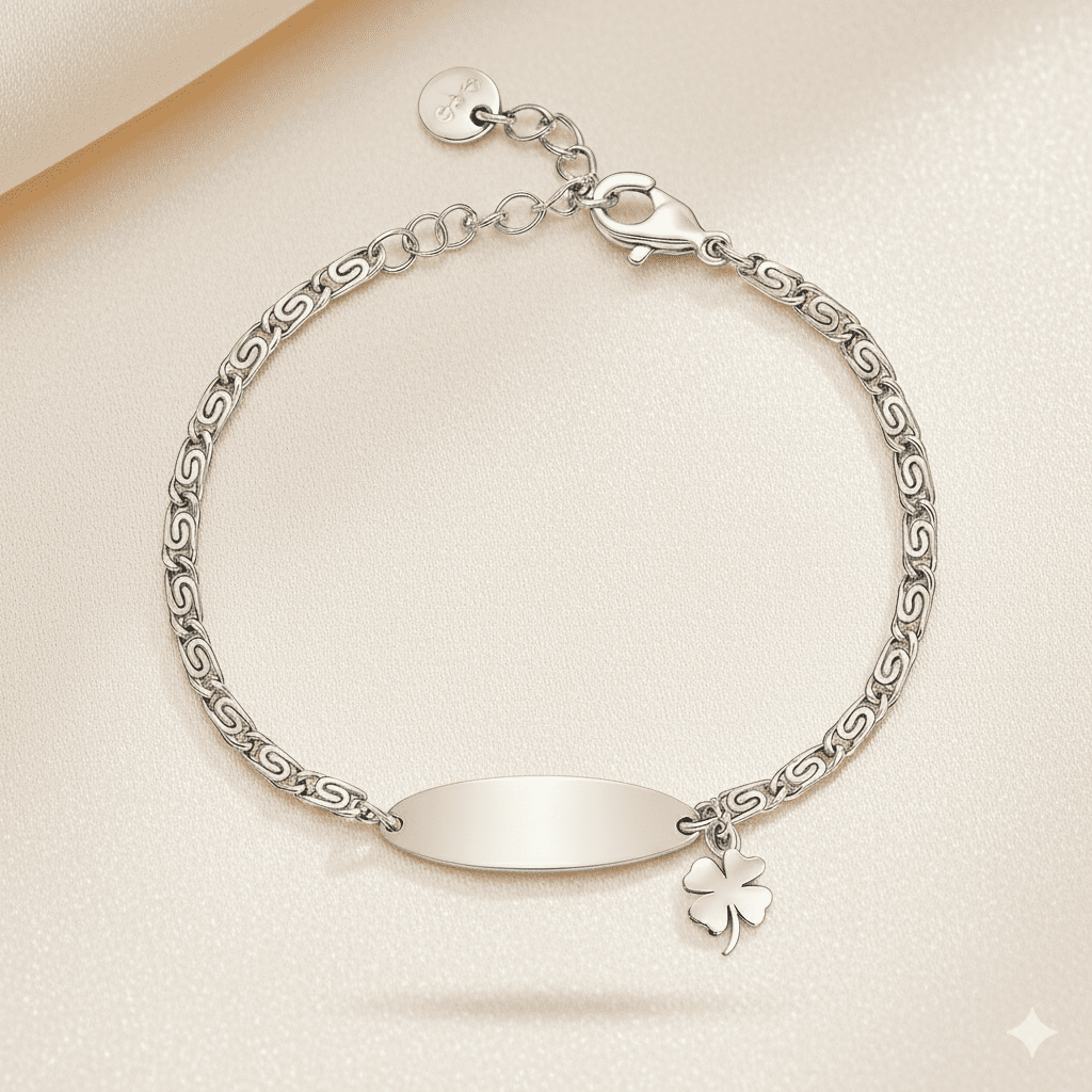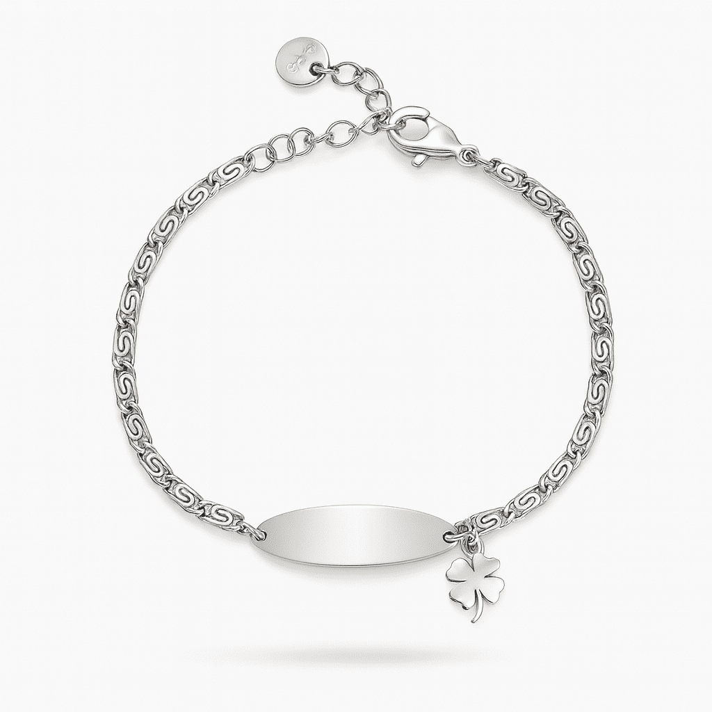 Çocuk Çelik Bileklik - İsme Özel Yazılı - Gümüş Renk - Yonca Yaprağı Detaylı - Espanzer Zincirli