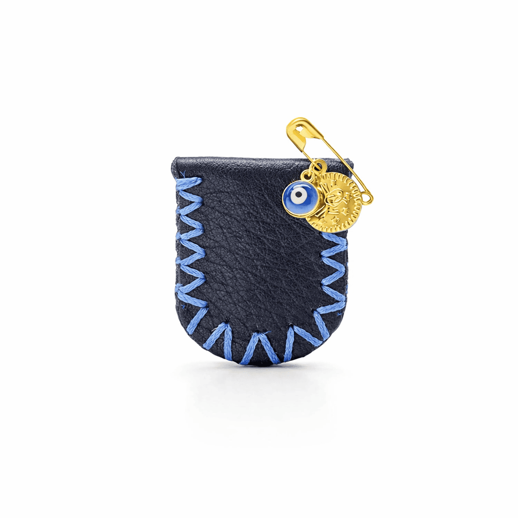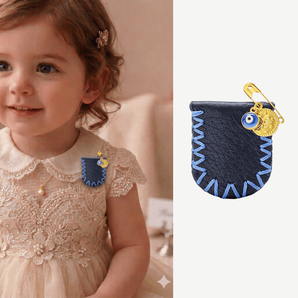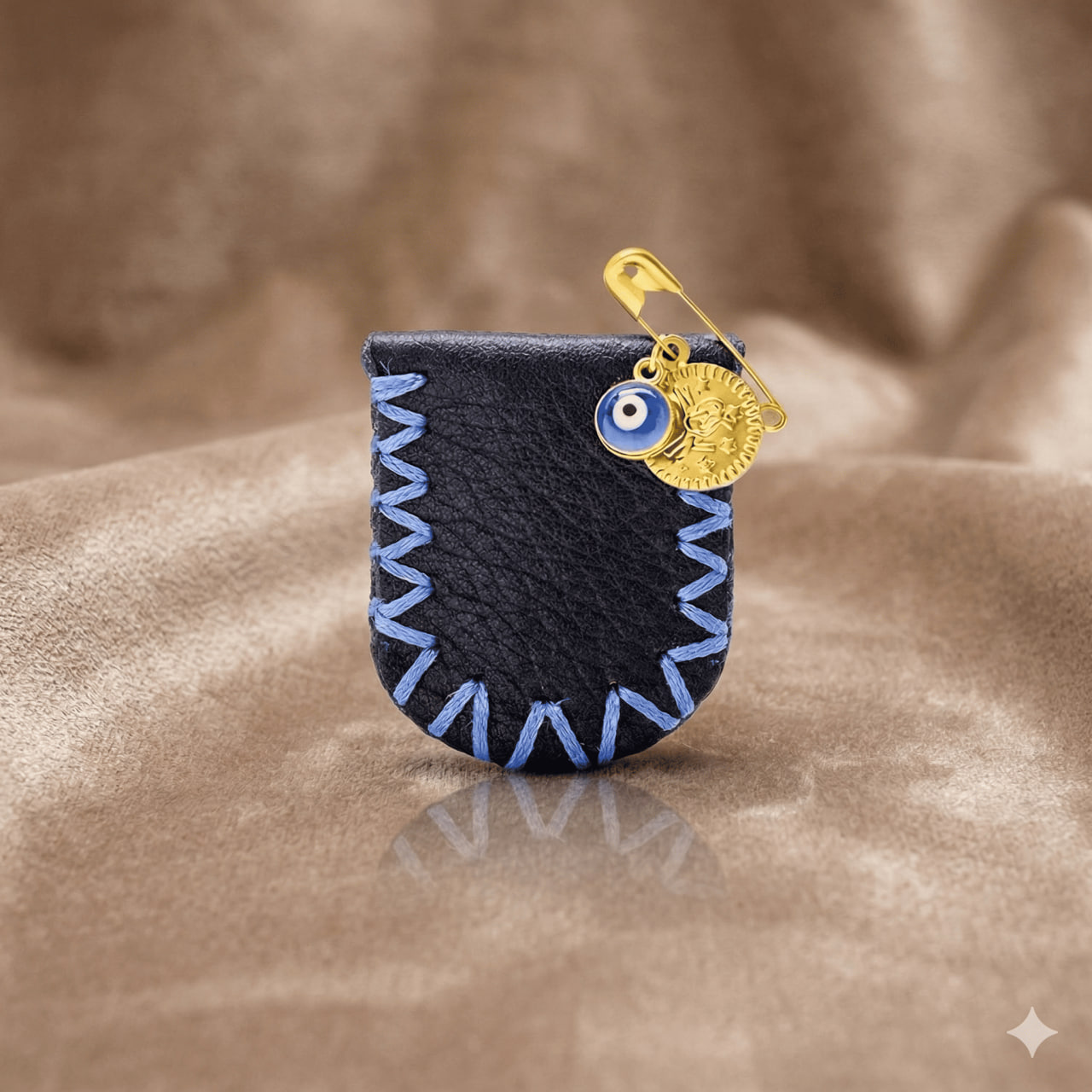 Çocuk Cevşen - İsme Özel Yazılı - Lacivert Renk - Gerçek Deriden El Yapımı - Gold Renk Yaka İğneli