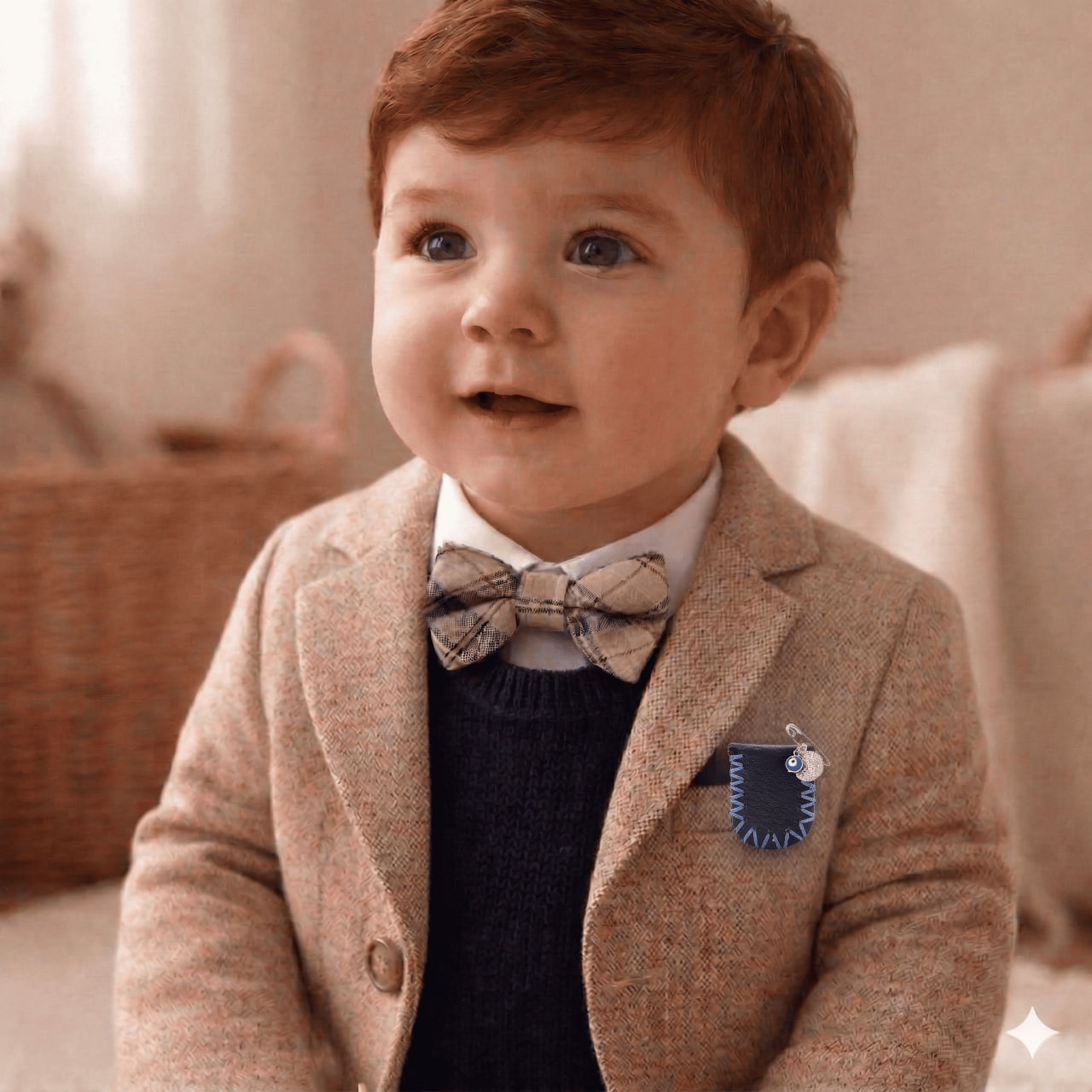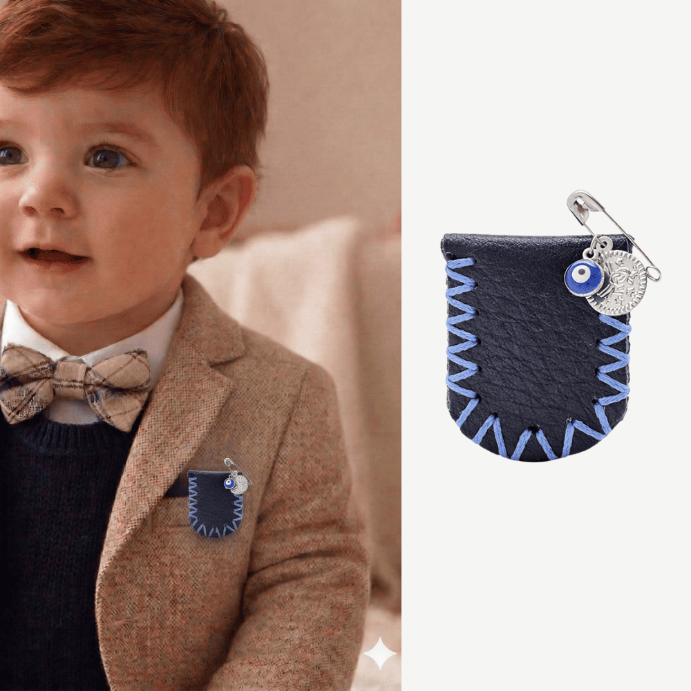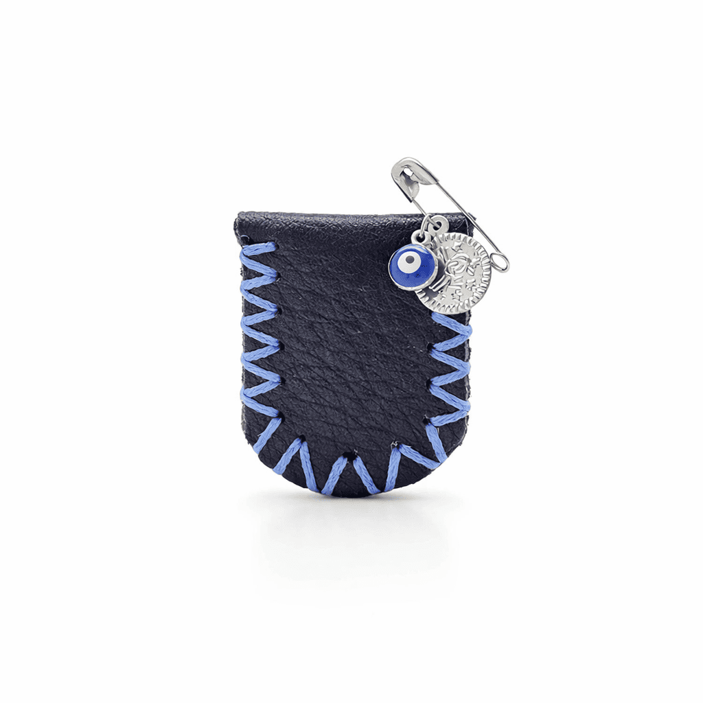 Çocuk Cevşen - İsme Özel Yazılı - Lacivert Renk - Gerçek Deriden El Yapımı - Gümüş Renk Yaka İğneli