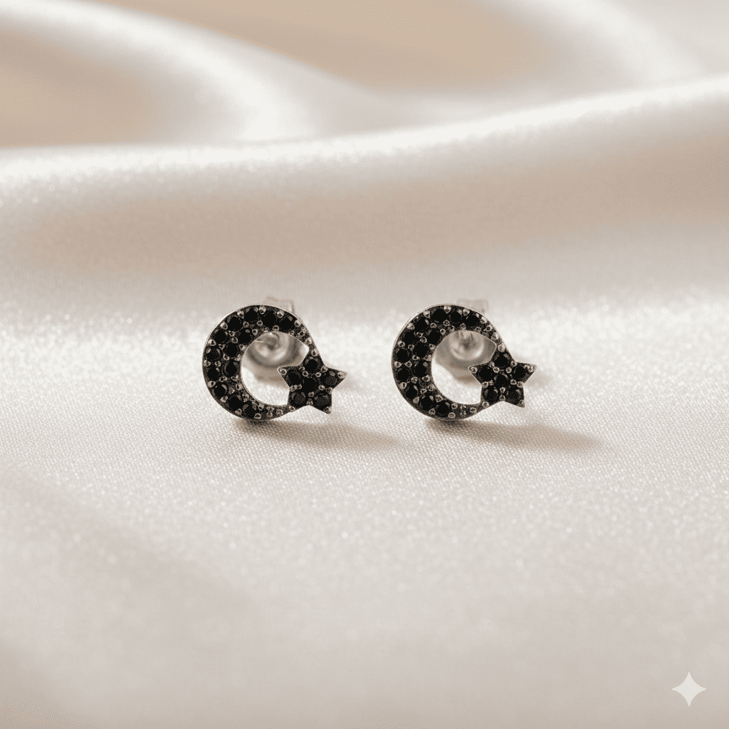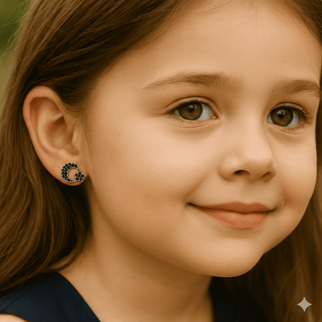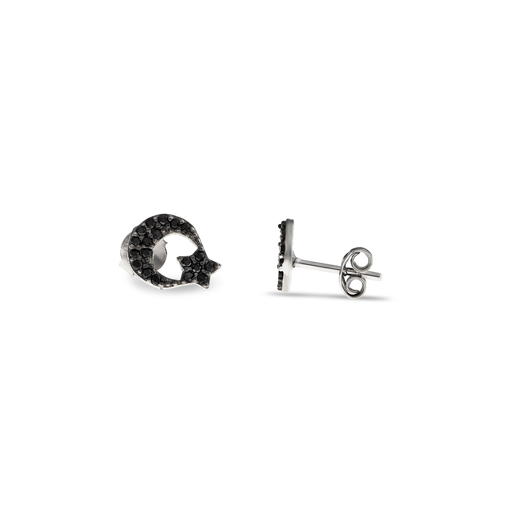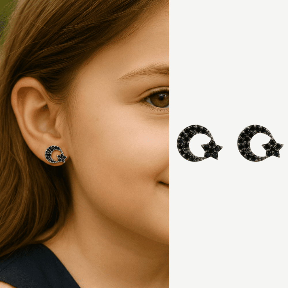 Çocuk Gümüş Küpe - 925 Ayar Gümüş - Ayyıldız Tasarım - Siyah Zirkon Taşlı - Gümüş Renk