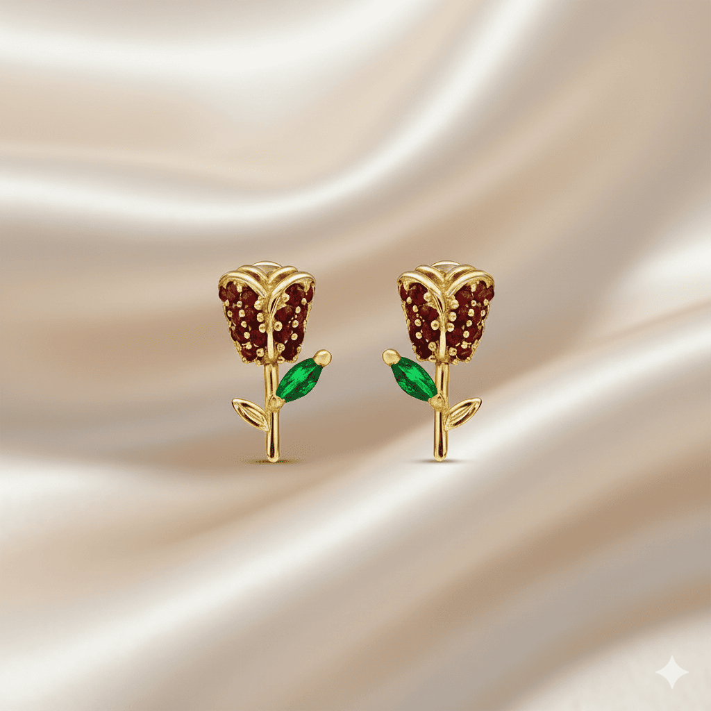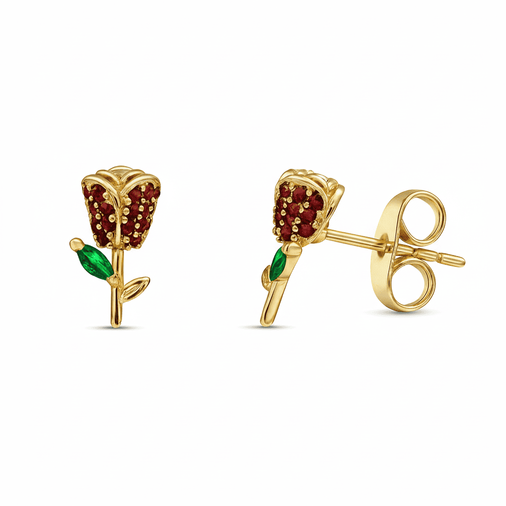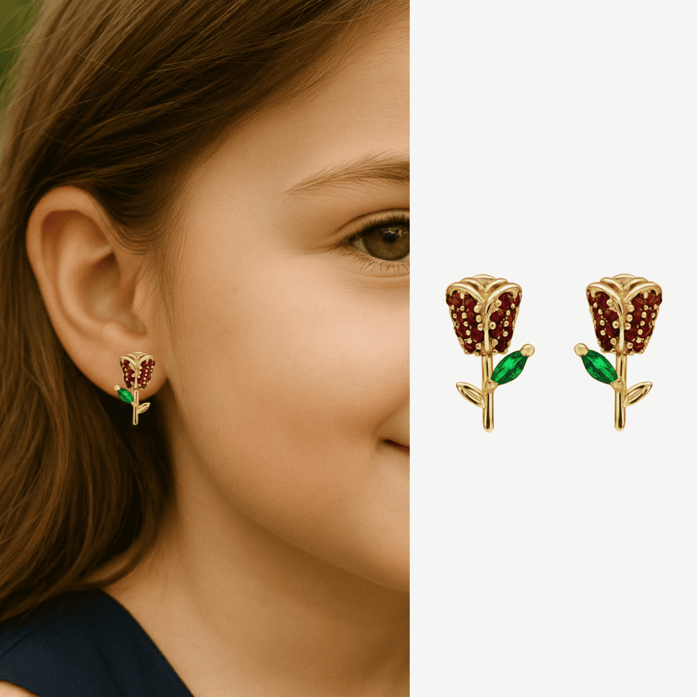Çocuk Xuping Çelik Küpe - Gül Detaylı - Kırmızı Zirkon Taşlı - Altın Renk