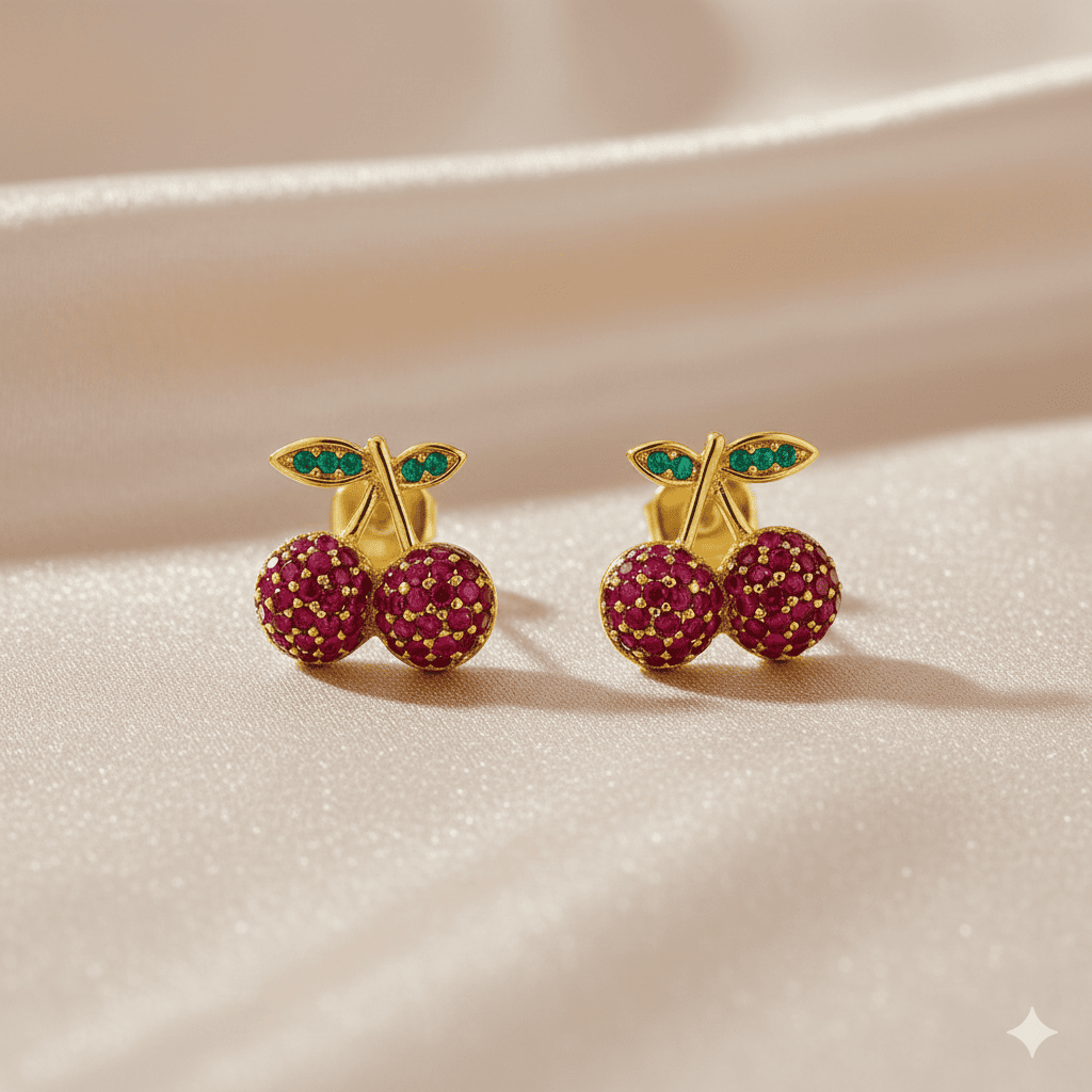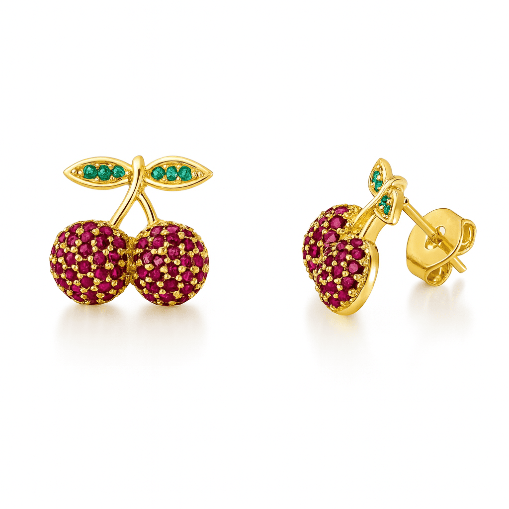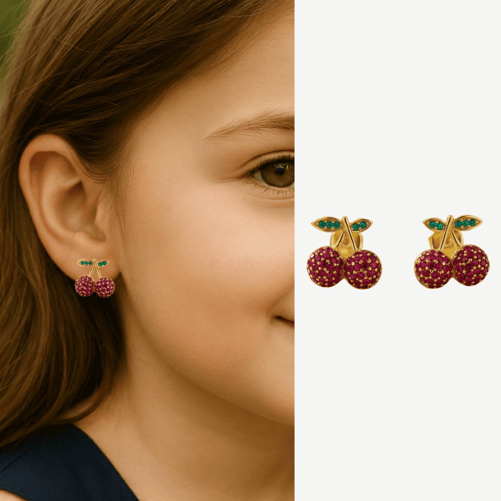 Çocuk Xuping Çelik Küpe - Kiraz Model - Fuşya Zirkon Taşlı - Altın Renk