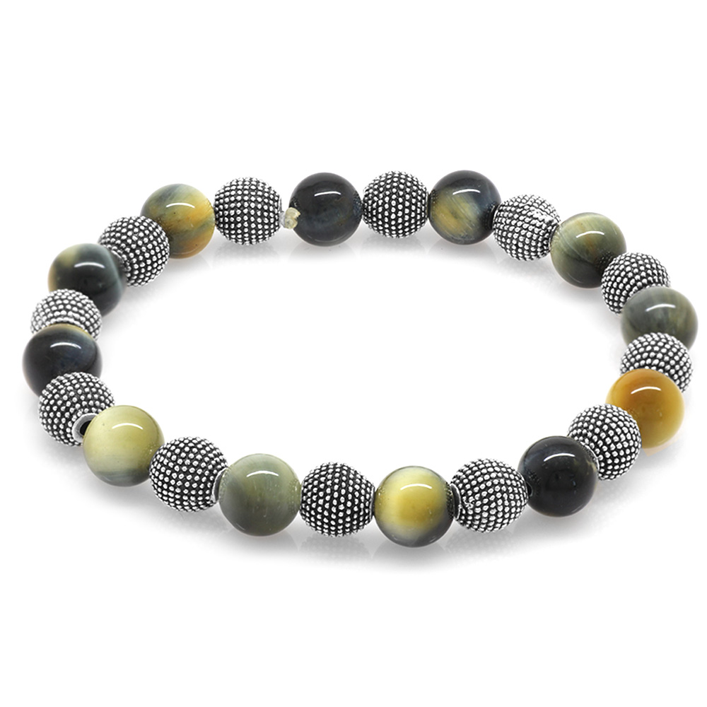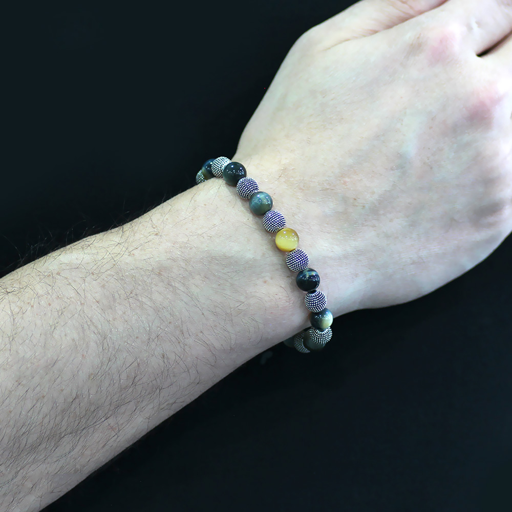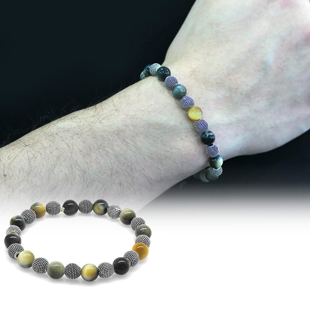 Kaplan Gözü Doğaltaş Bileklik - Renkli - Metal Kombinli - Küre Kesim