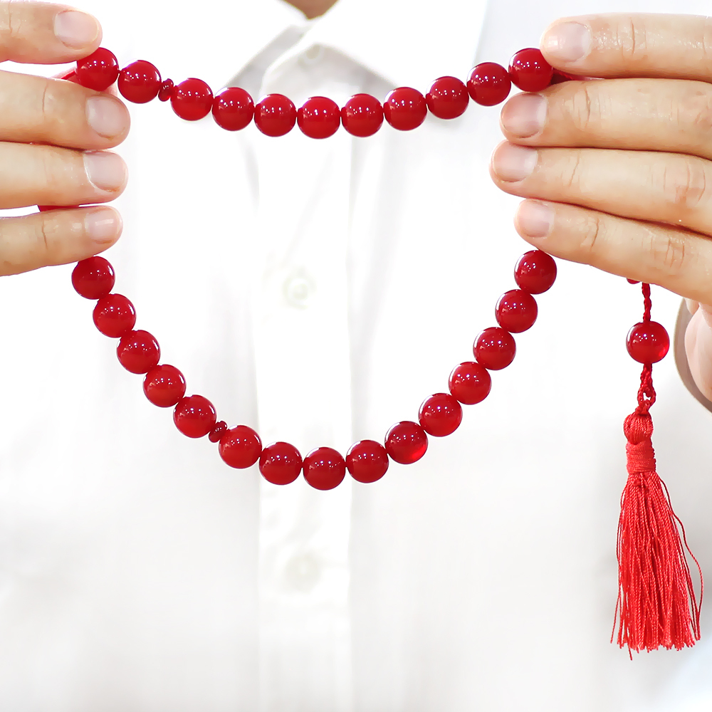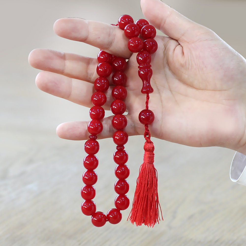 Çubuk Sıkma Kehribar Tesbih - Osmanlı Saray Püsküllü - Kırmızı Renk - Küre Kesim