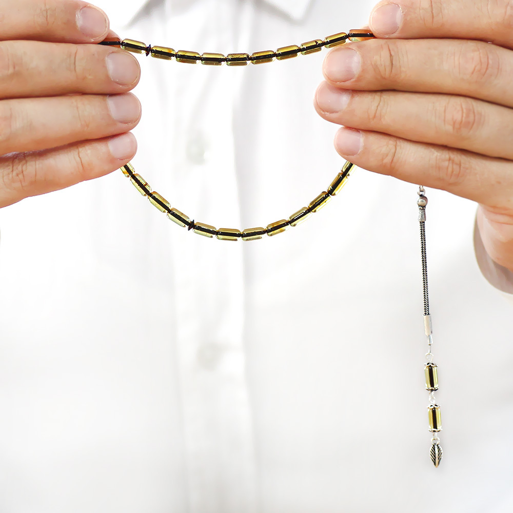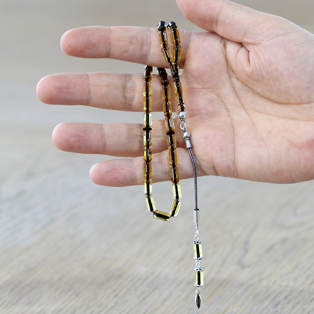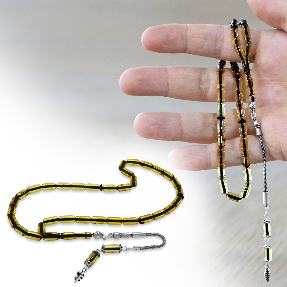 Damla Kehribar Tesbih - 925 Ayar Gümüş Püsküllü - Kapsül Kesim - Ihlamur Sarı Renk