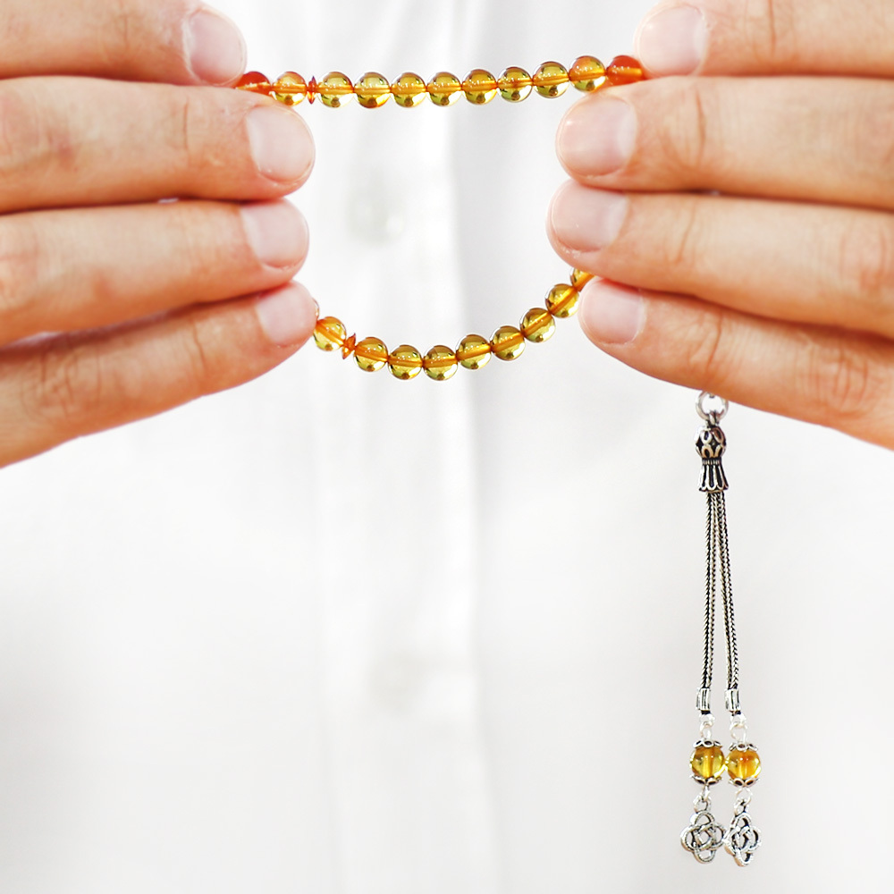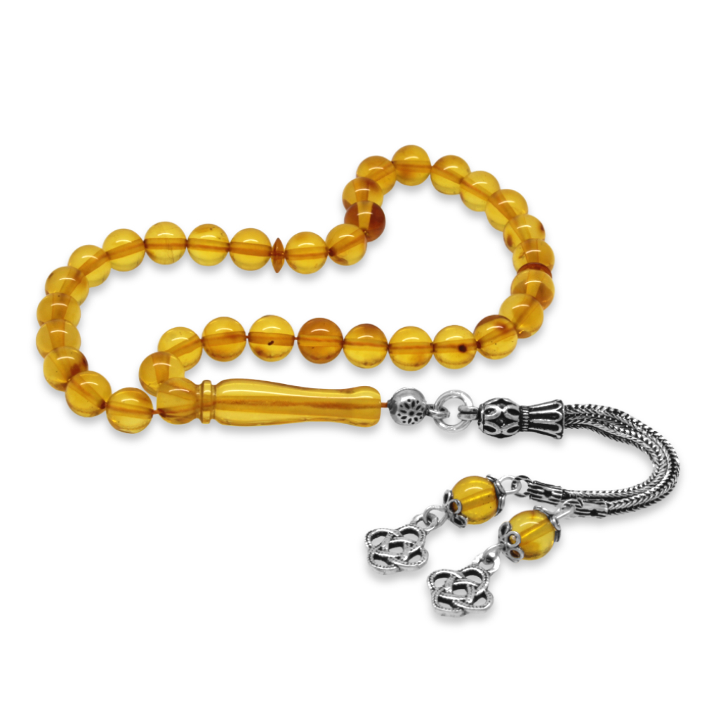 Damla Kehribar Tesbih - 925 Ayar Gümüş Püsküllü - Küre Kesim - Sarı Renk