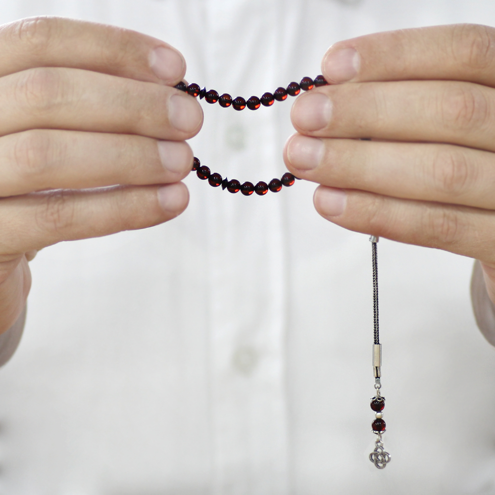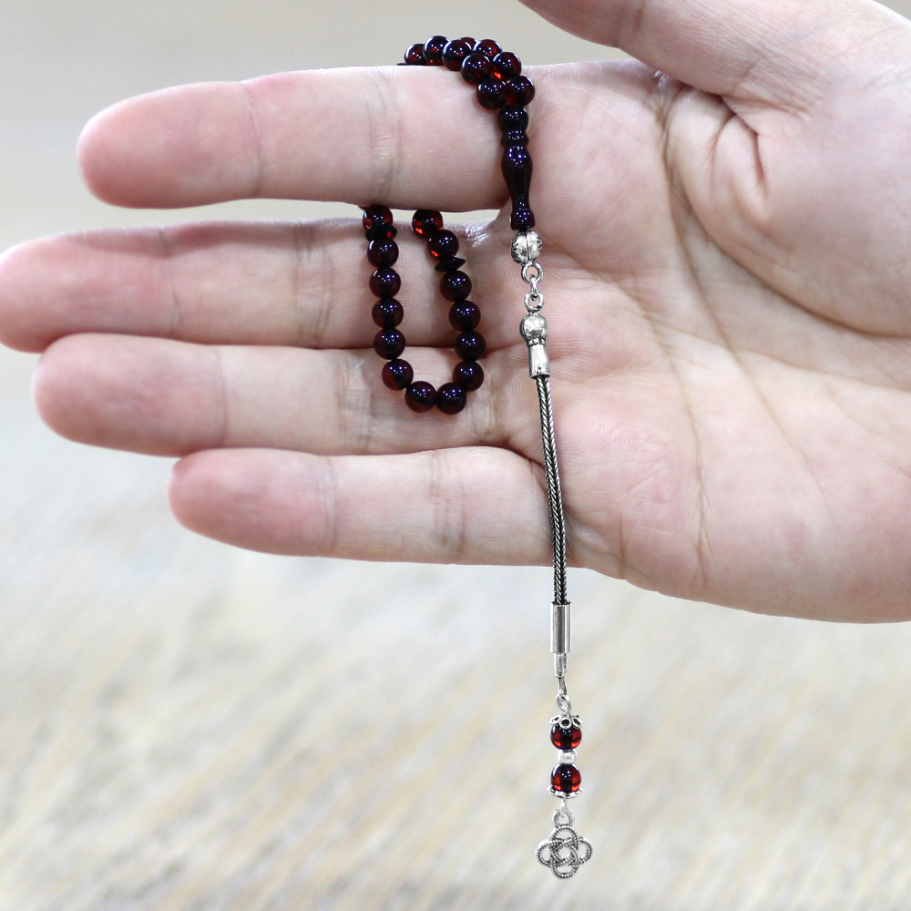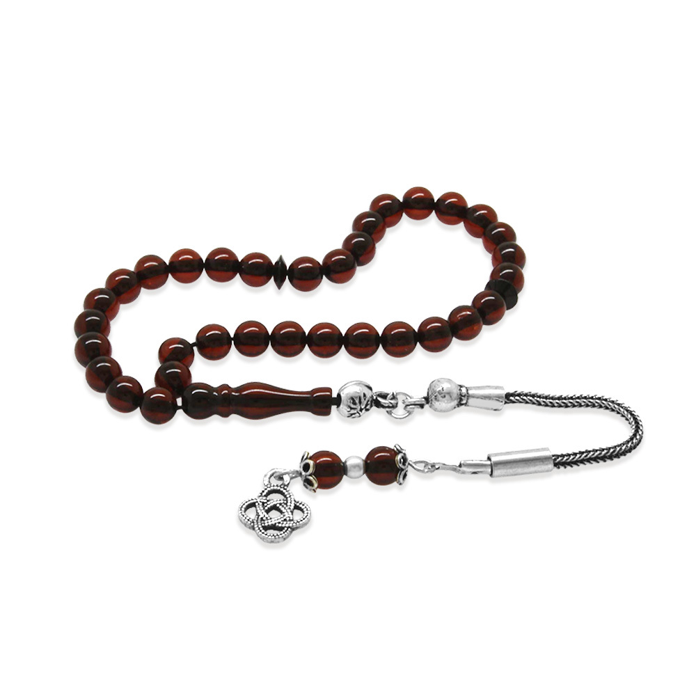 Damla Kehribar Tesbih - 925 Ayar Gümüş Püsküllü - Mini Boy - Koyu Kırmızı - Küre Kesim