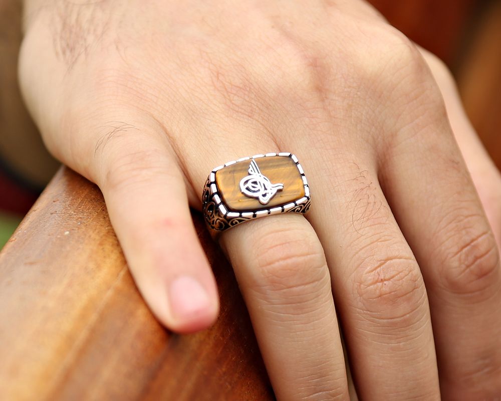 Dekoratif Model Kaplan Gözü Üzerine Tuğralı Gümüş Yüzük - 6