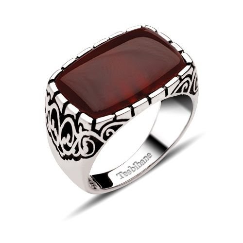 Dekoratif Model Kırmızı Akik Taşlı Gümüş Yüzük