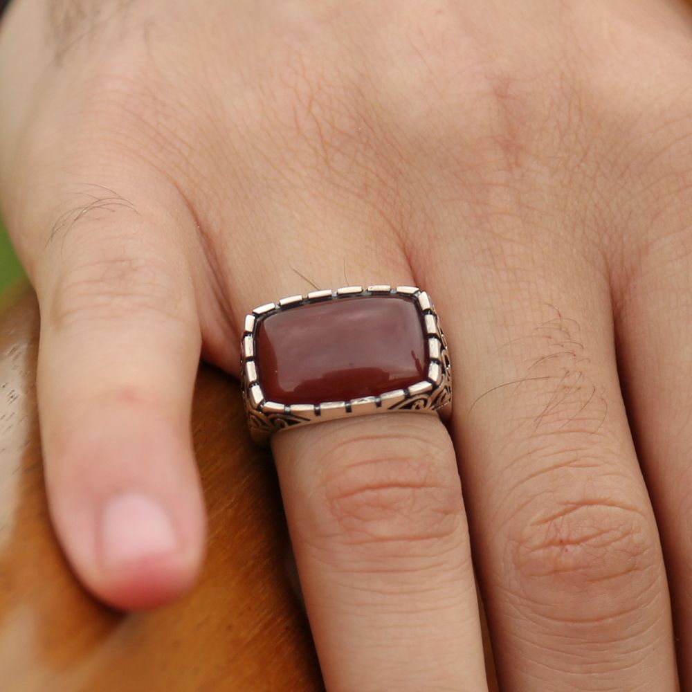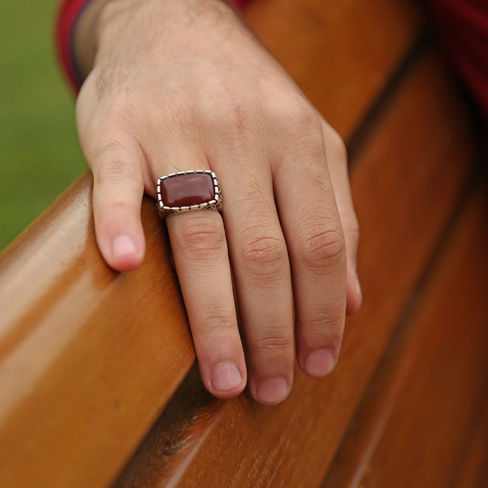 Dekoratif Model Kırmızı Akik Taşlı Gümüş Yüzük - 1