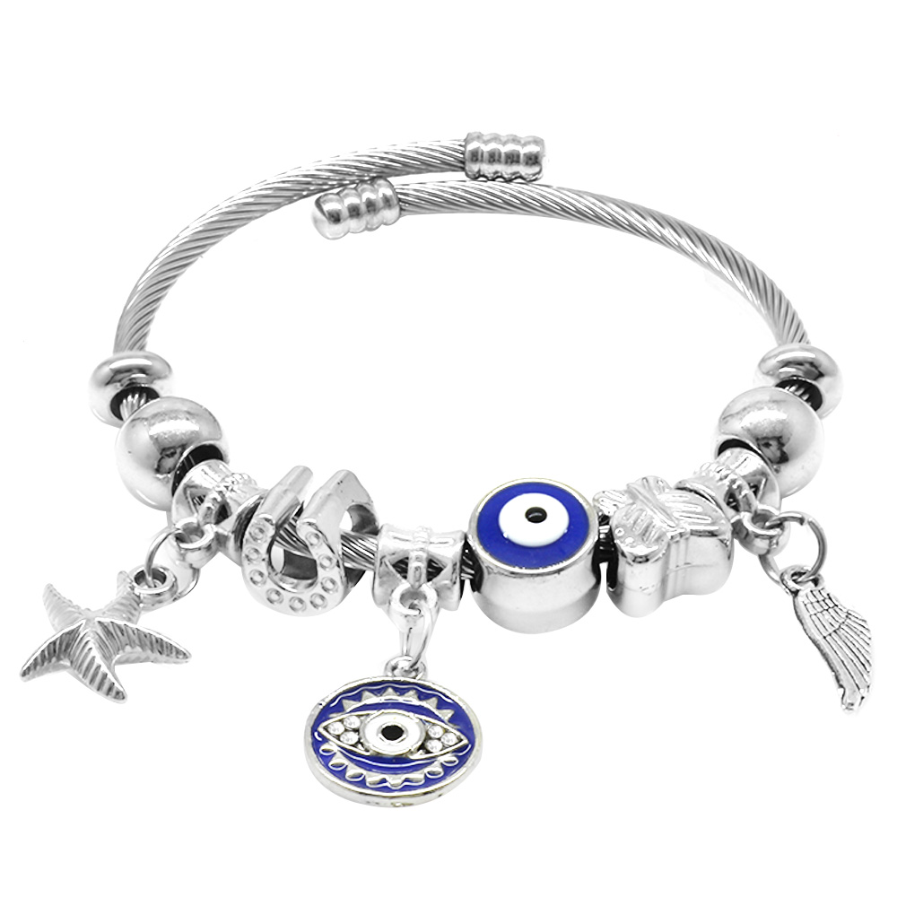 Deniz Yıldızı ve Melek Kanadı Detaylı Pandora Tasarım Gümüş Renk Çelik Kadın Sallantılı Bileklik
