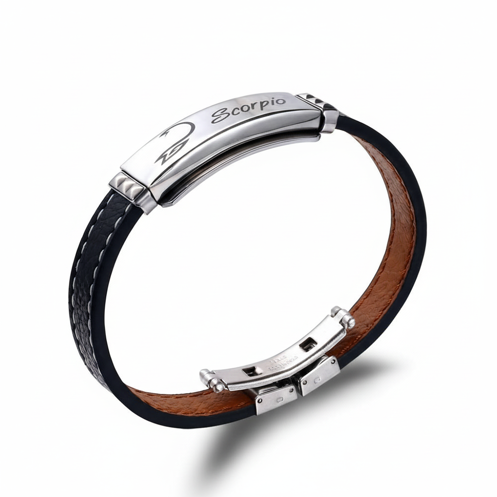 Deri ve Çelik Bileşim İsme Özel Yazılı Akrep Burcu Erkek Bileklik - 1