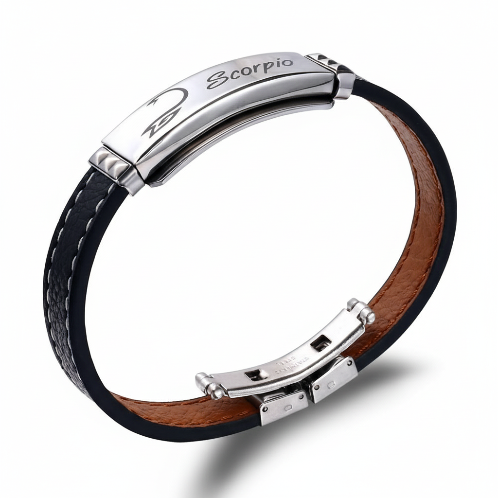 Deri ve Çelik Bileşim İsme Özel Yazılı Akrep Burcu Kadın Bileklik - 1
