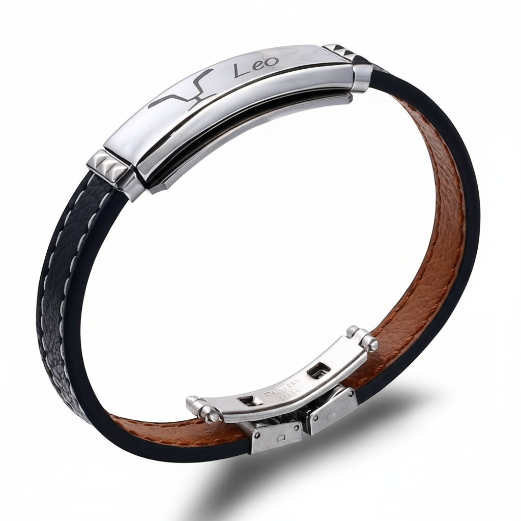 Deri ve Çelik Bileşim İsme Özel Yazılı Aslan Burcu Erkek Bileklik