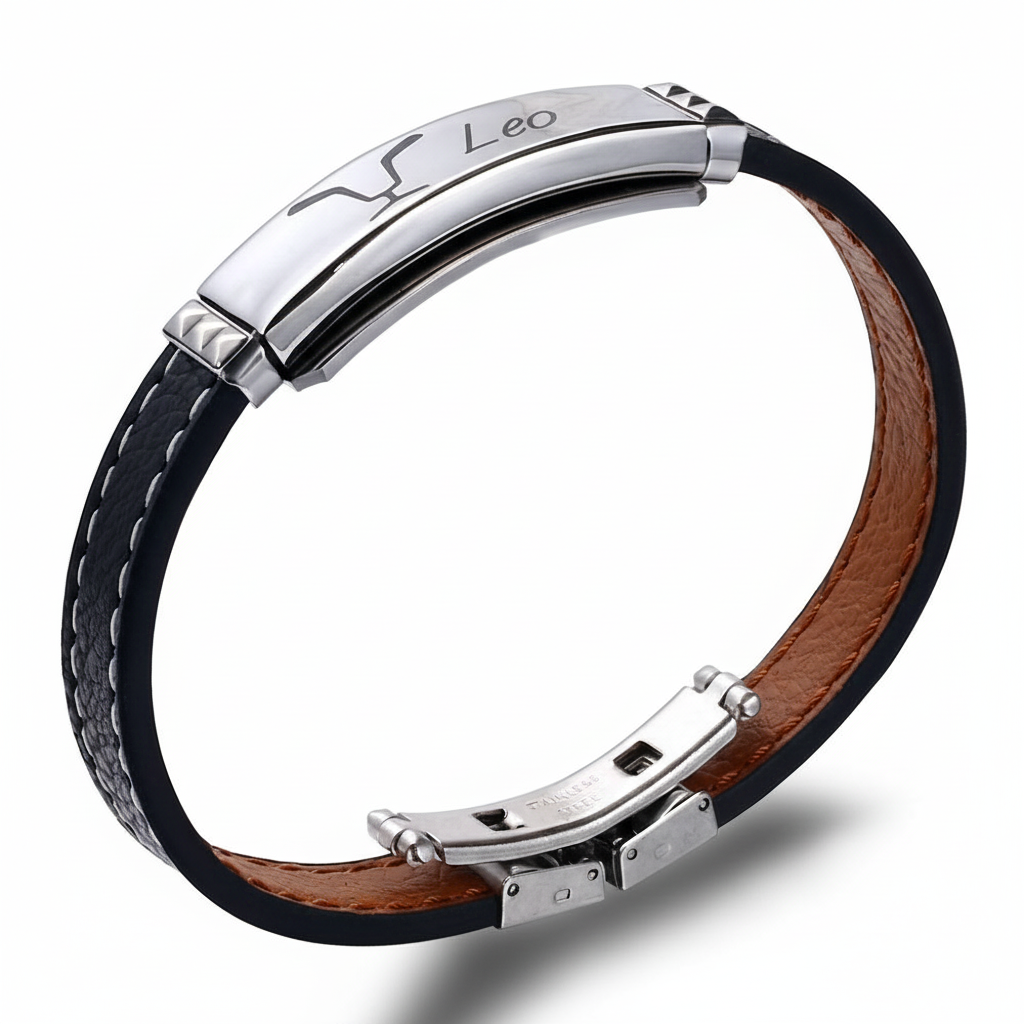 Deri ve Çelik Bileşim İsme Özel Yazılı Aslan Burcu Kadın Bileklik