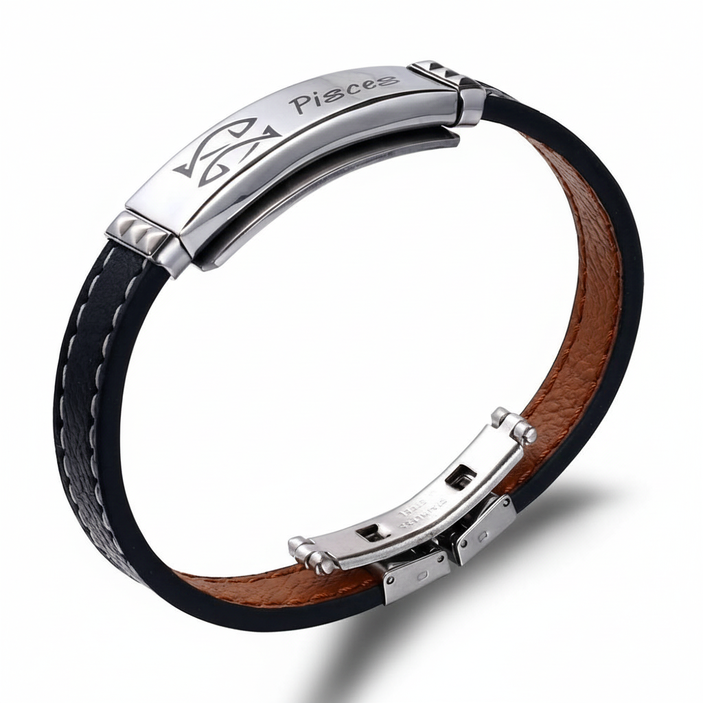 Deri ve Çelik Bileşim İsme Özel Yazılı Balık Burcu Erkek Bileklik