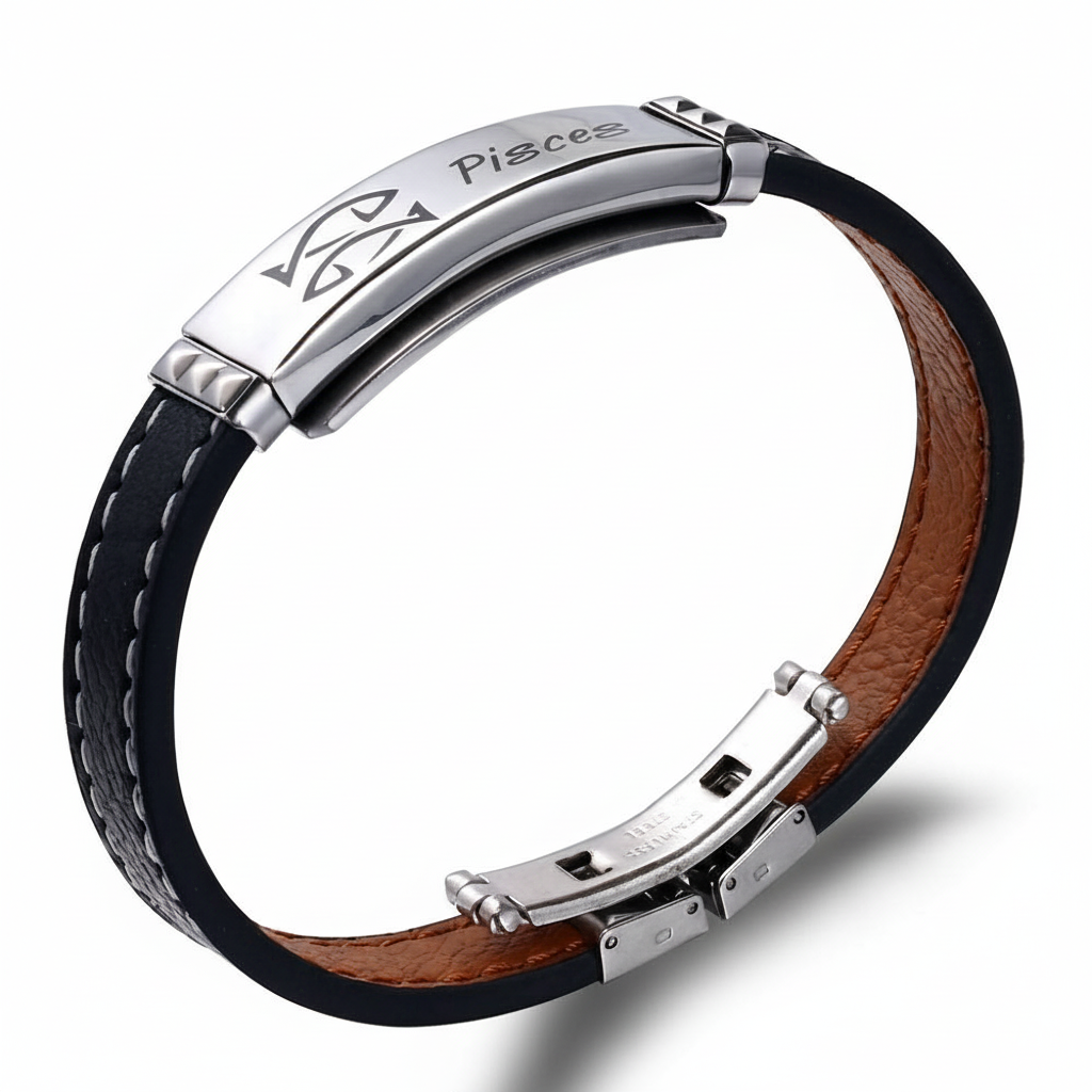 Deri ve Çelik Bileşim İsme Özel Yazılı Balık Burcu Kadın Bileklik