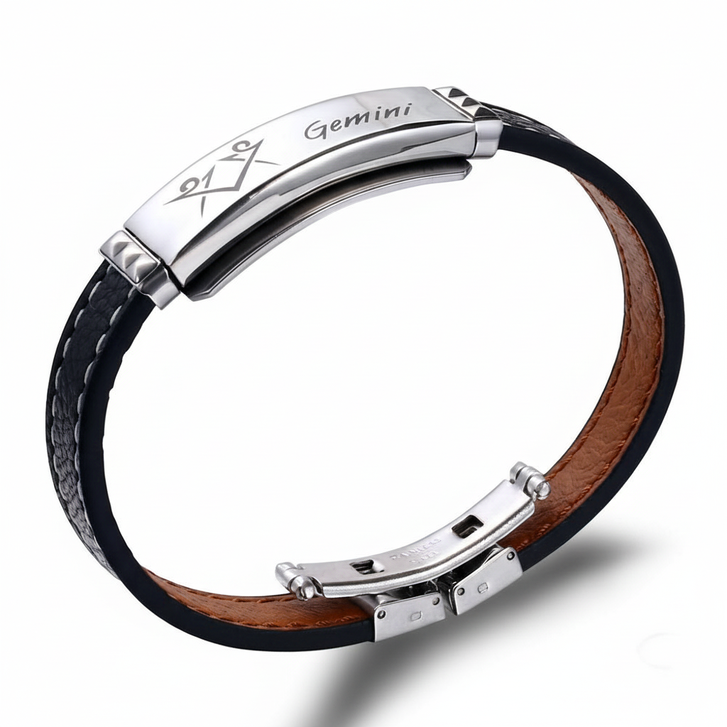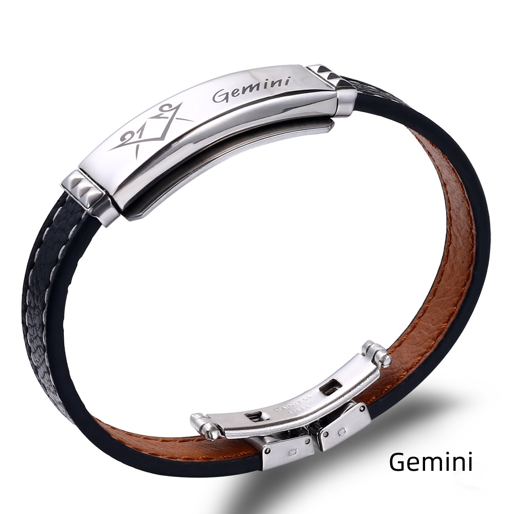 Deri ve Çelik Bileşim İsme Özel Yazılı İkizler Burcu Erkek Bileklik