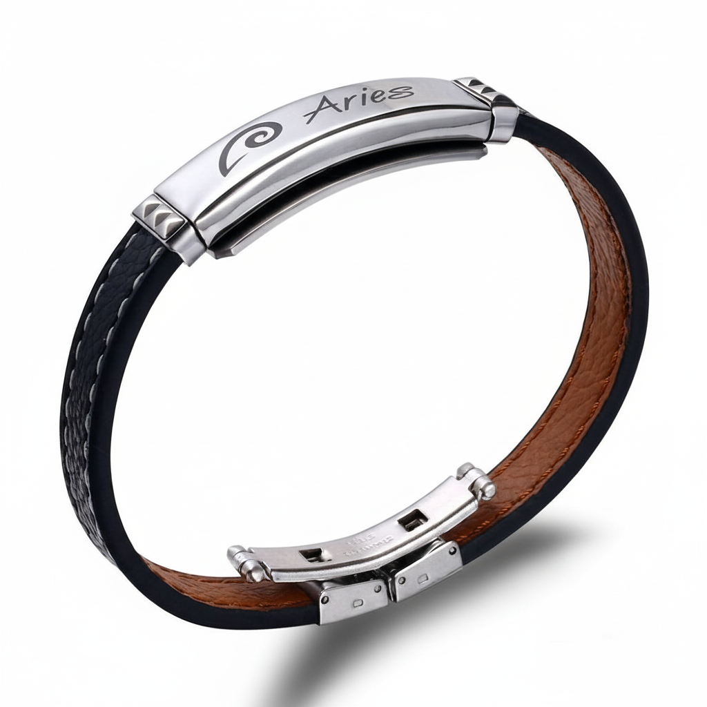 Deri ve Çelik Bileşim İsme Özel Yazılı Koç Burcu Kadın Bileklik