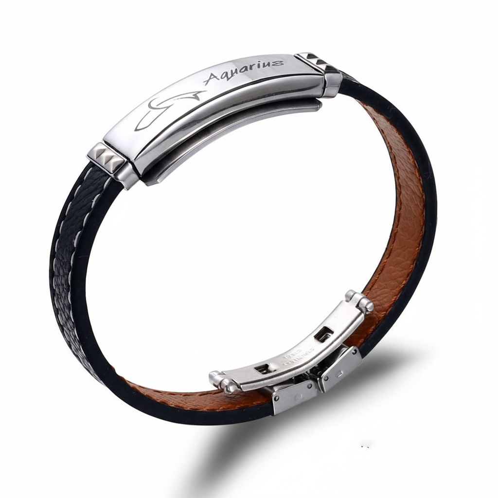 Deri ve Çelik Bileşim İsme Özel Yazılı Kova Burcu Erkek Bileklik