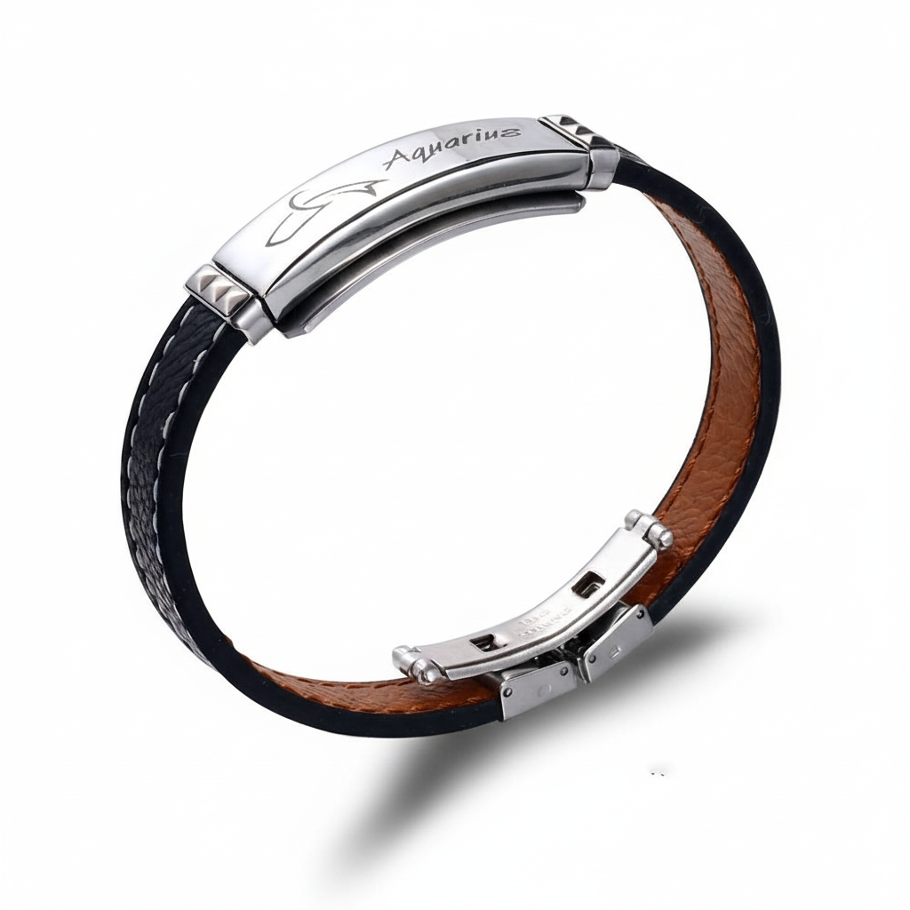 Deri ve Çelik Bileşim İsme Özel Yazılı Kova Burcu Kadın Bileklik