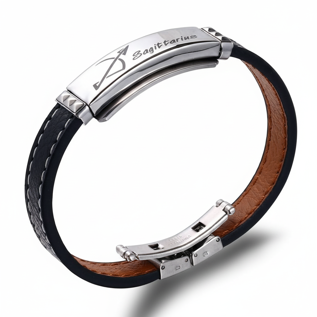 Deri ve Çelik Bileşim İsme Özel Yazılı Yay Burcu Erkek Bileklik