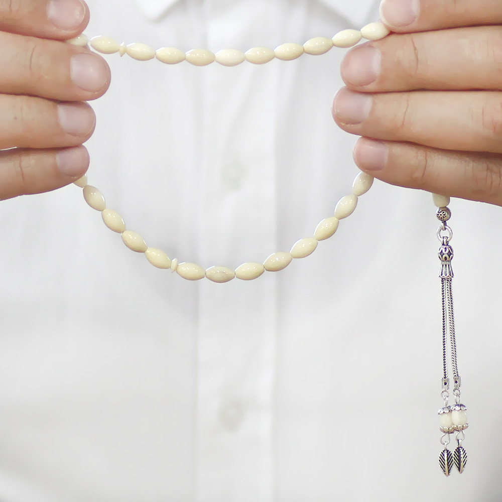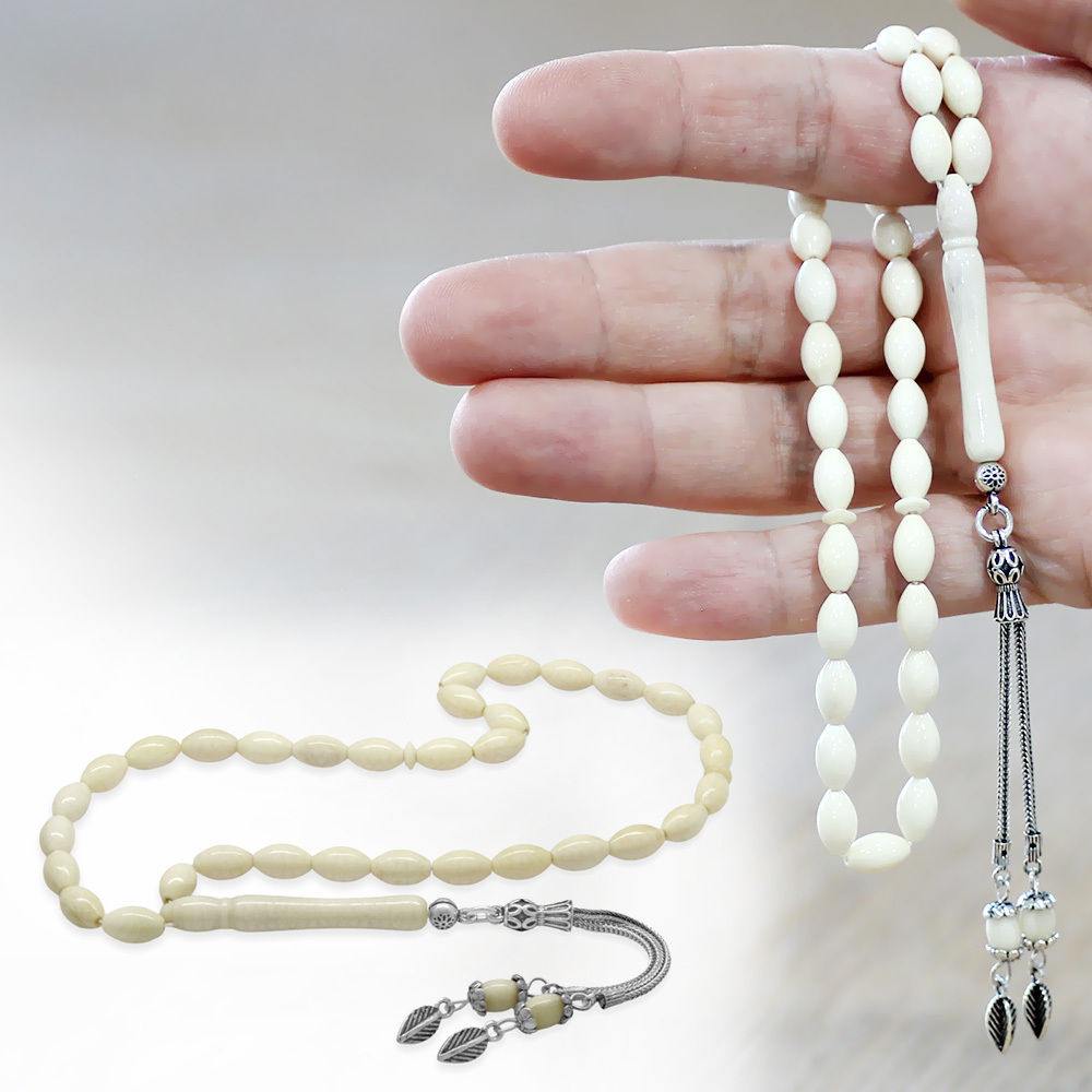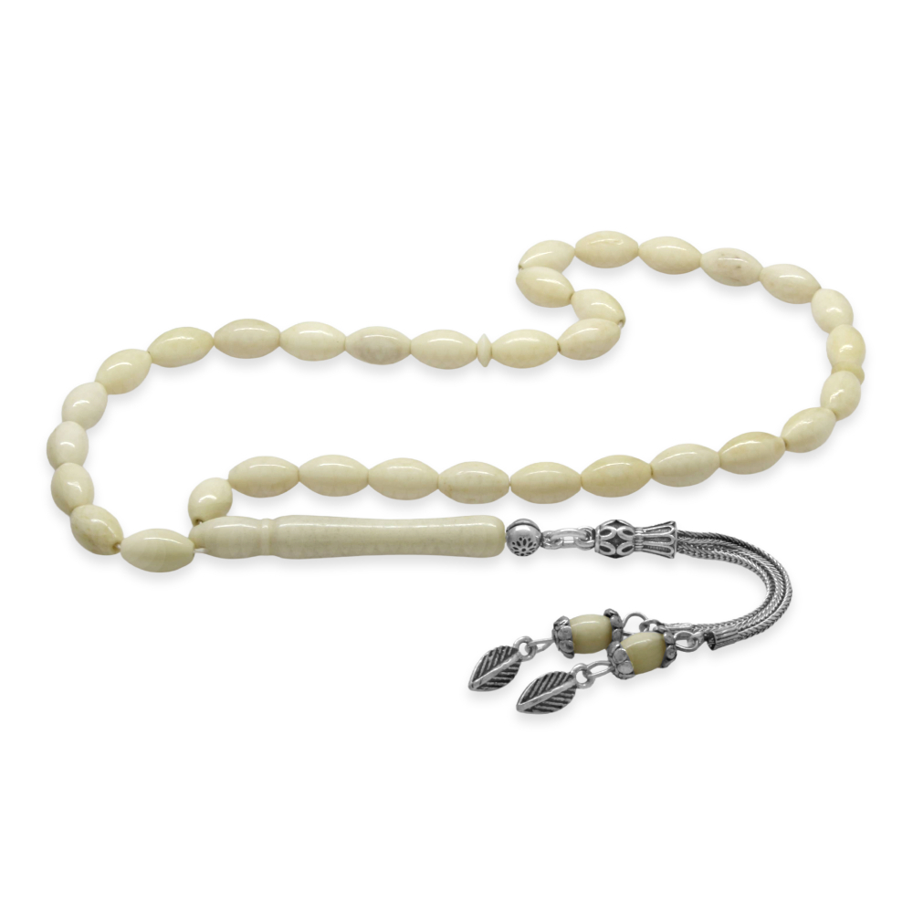 Deve Kemiği Tesbih - 925 Ayar Gümüş Püsküllü - Naturel Renk - Arpa Kesim