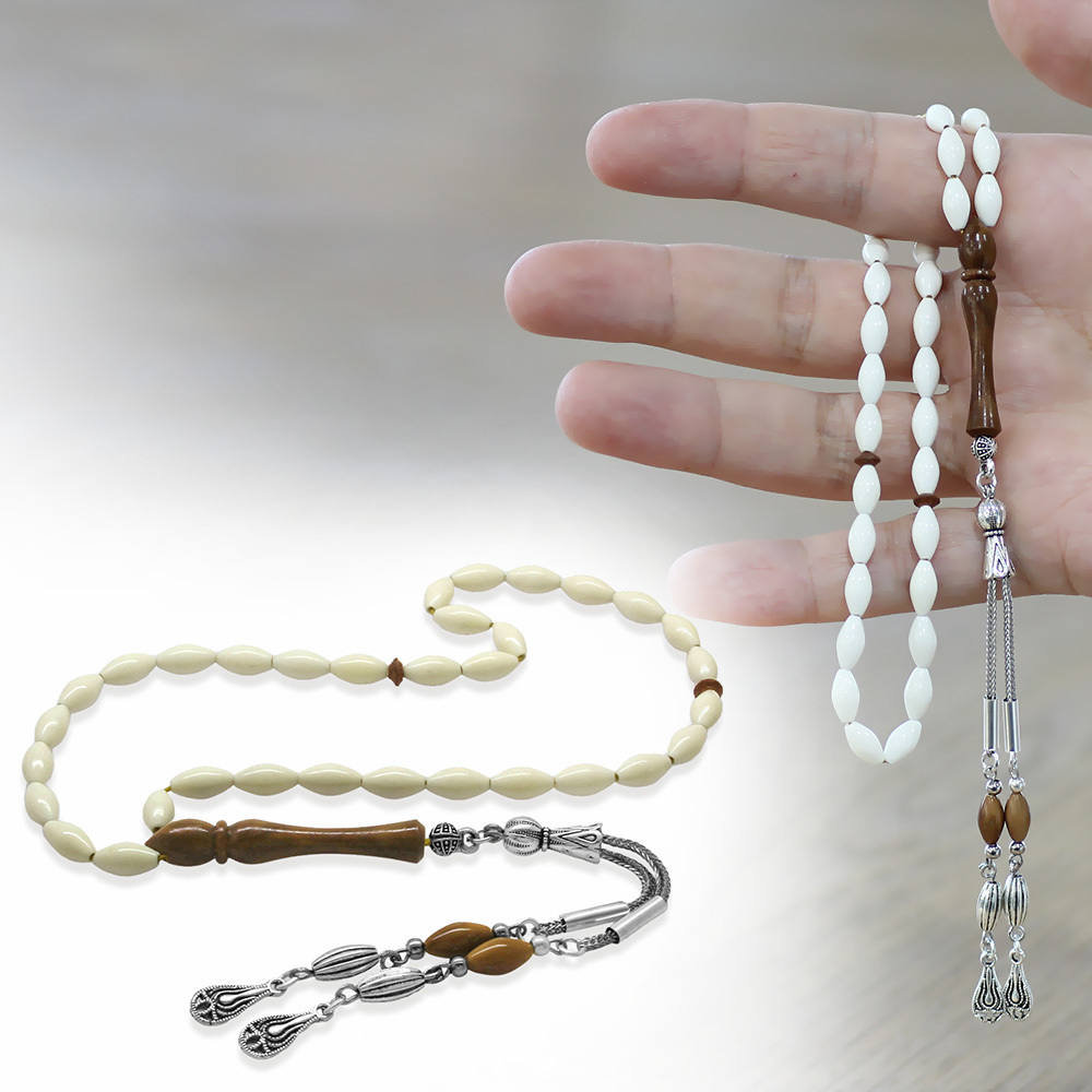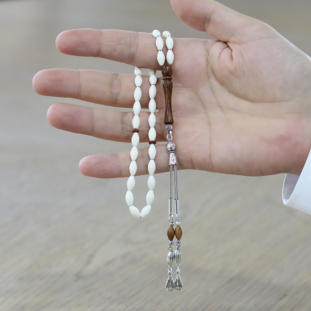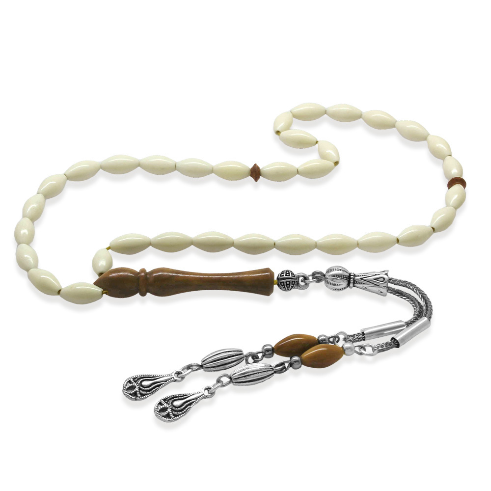 Deve Kemiği Tesbih - Kararmaz Metal Damla Püsküllü - Kuka Kombinasyonlu - Beyaz Renk - Arpa Kesim