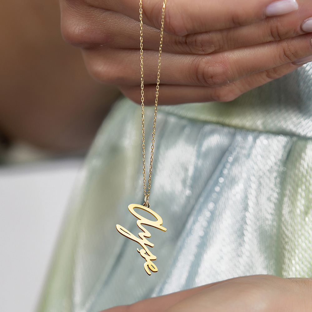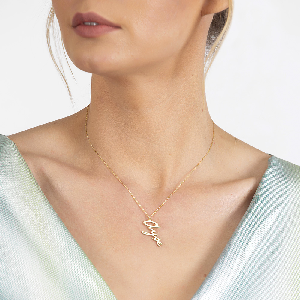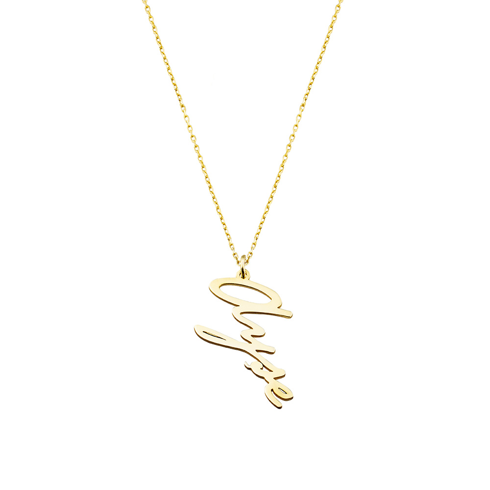 Dikey Tasarım İsme Özel Yazılı Altın Renk 925 Ayar Gümüş Bayan Kolye