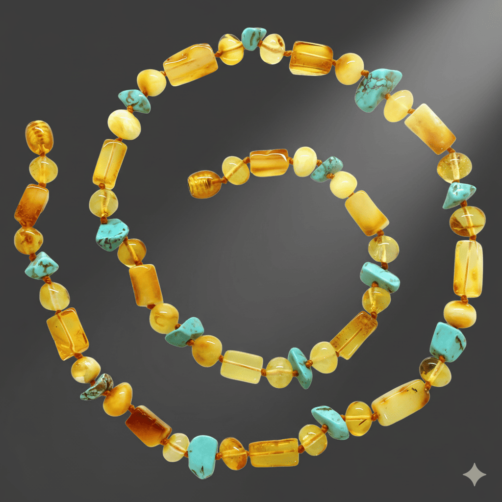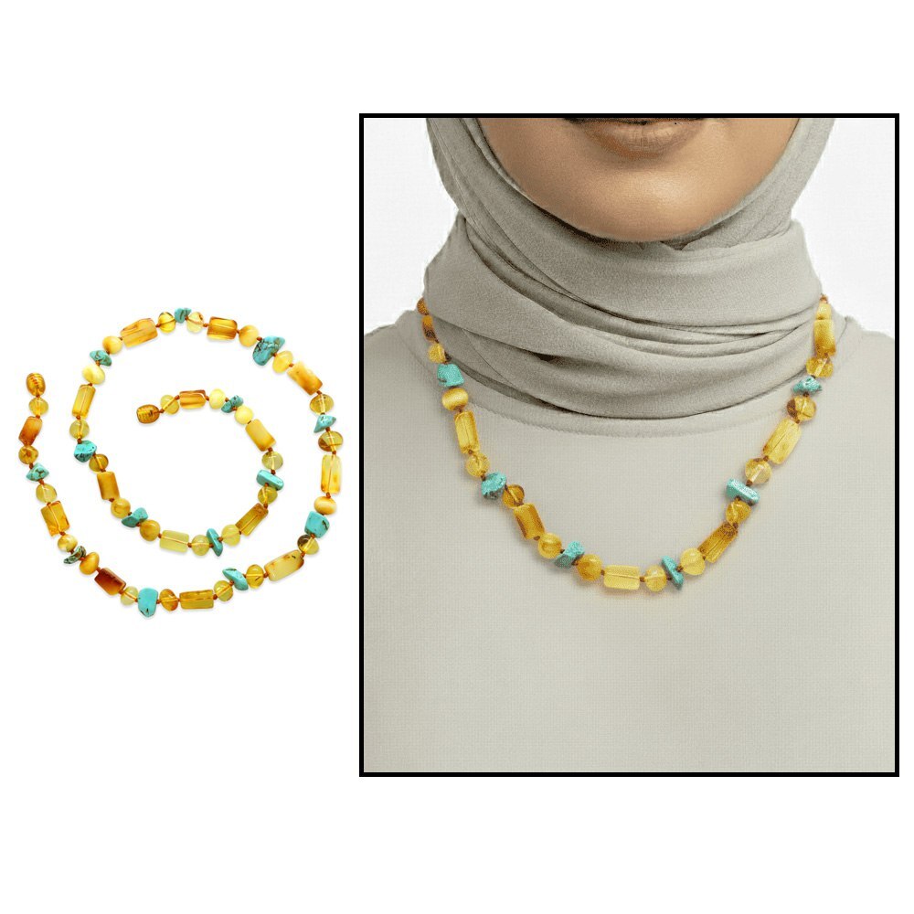 Doğal Form Bal Sarı Renkli Firuze Doğaltaş Süslemeli Hakiki Damla Kehribar Kadın Kolye