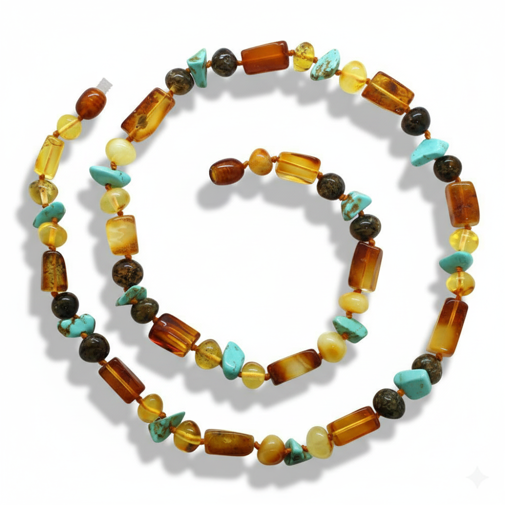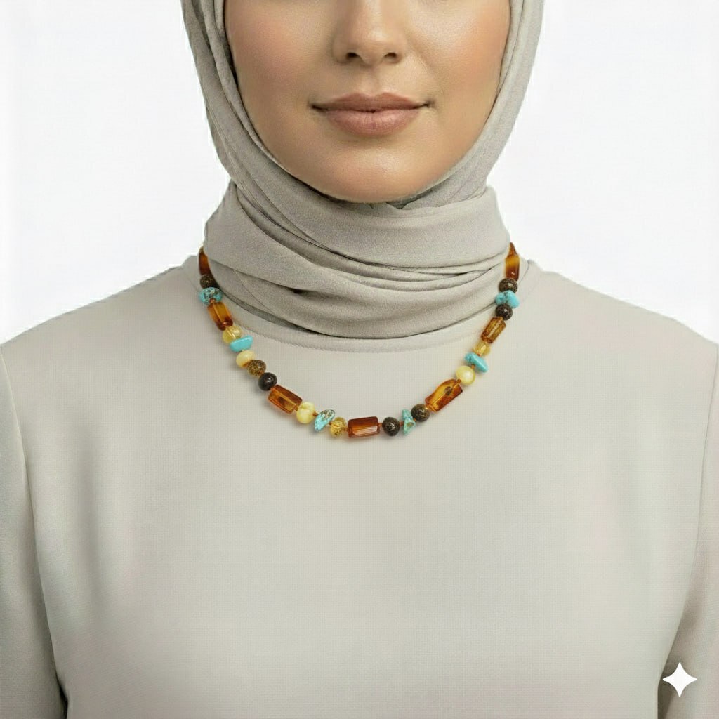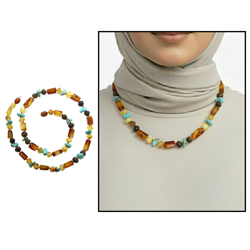 Doğal Form Çok Renkli Firuze Doğaltaş Süslemeli Hakiki Damla Kehribar Kadın Kolye