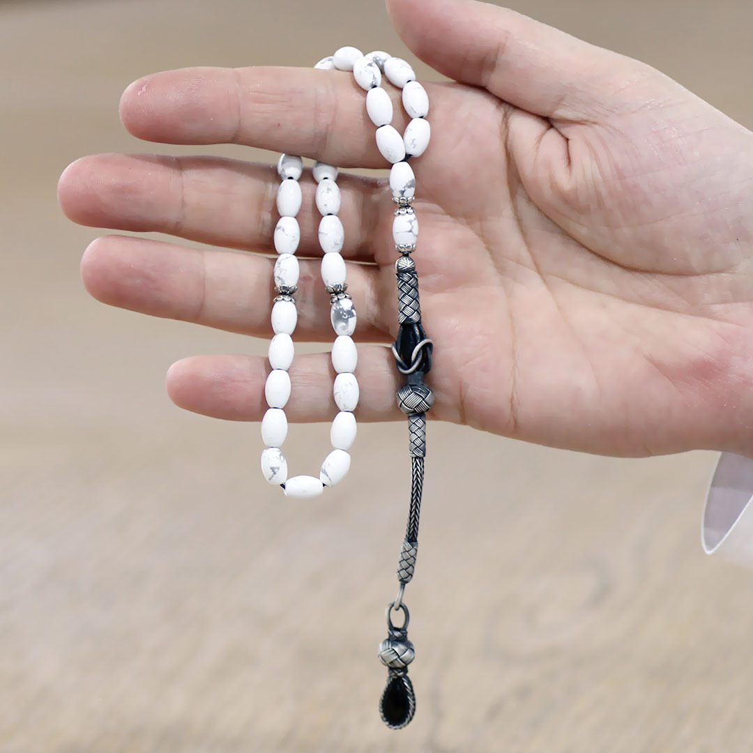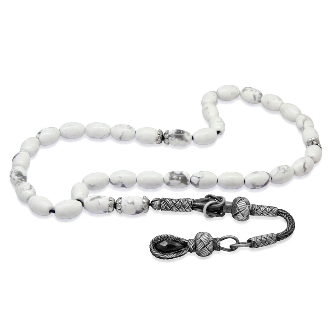 Doğaltaş Havlit Tesbih - 1000 Ayar Gümüş Kazaz Püsküllü - Gri Beyaz Renk - Arpa Kesim