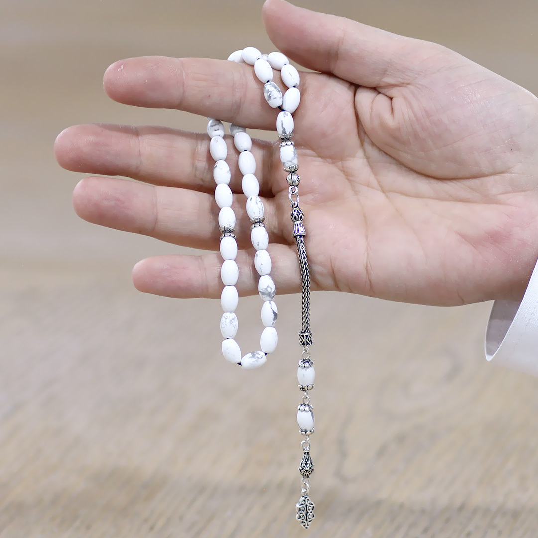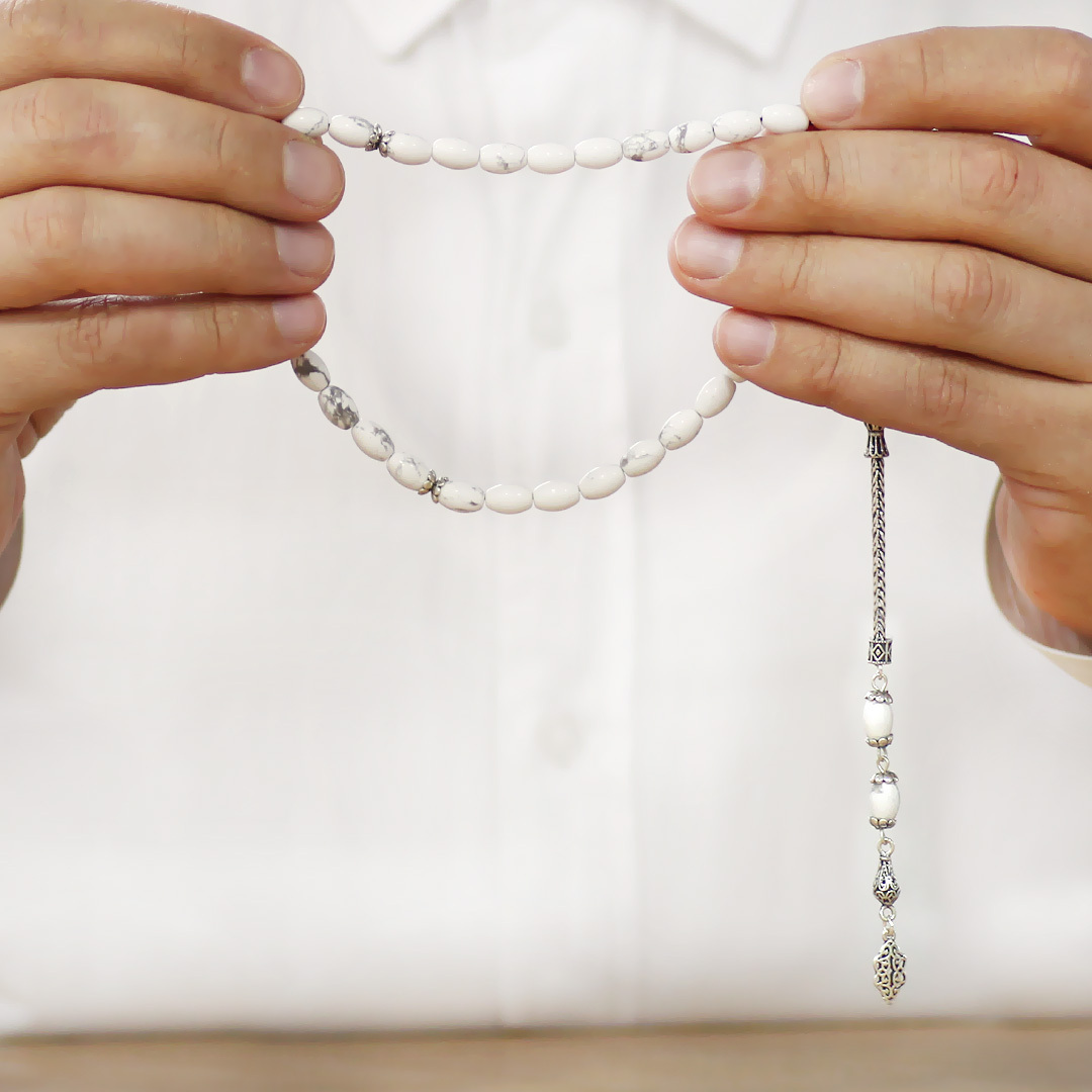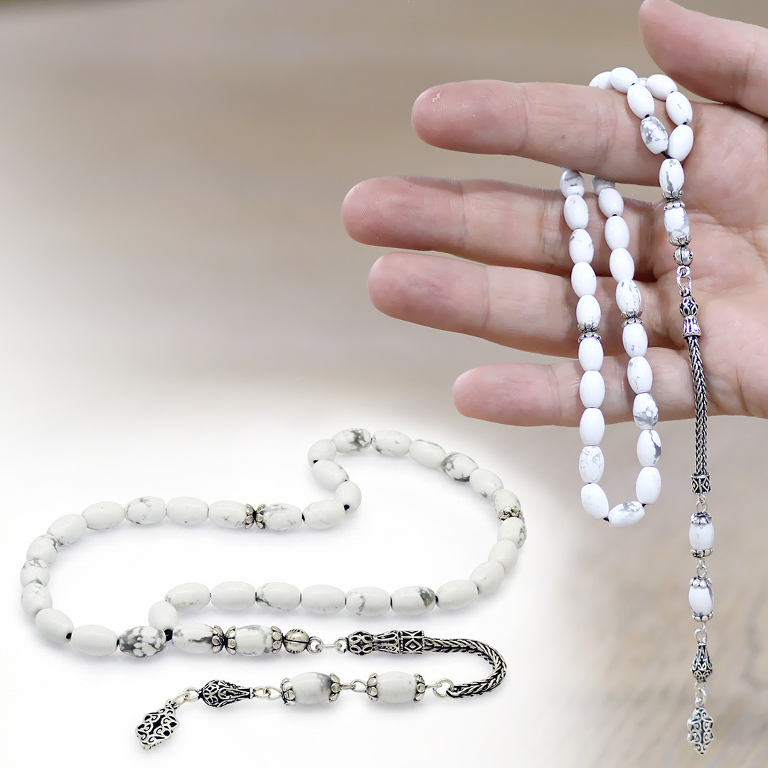 Doğaltaş Havlit Tesbih - 925 Ayar Gümüş Püsküllü - Gri Beyaz Renk - Arpa Kesim