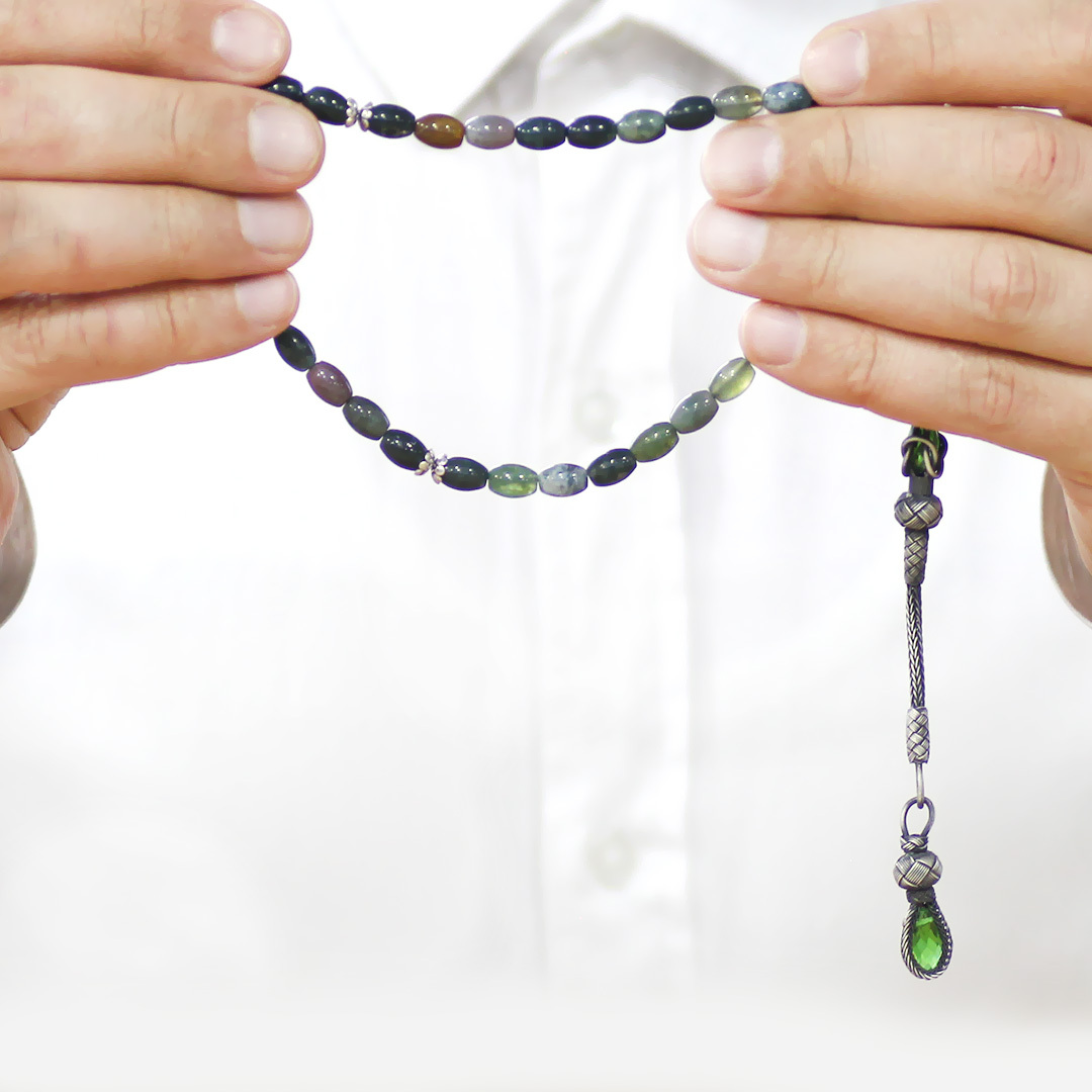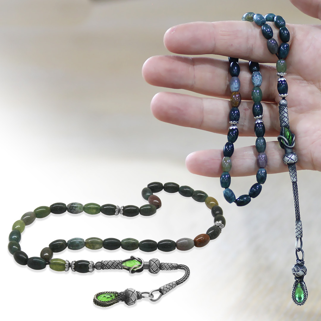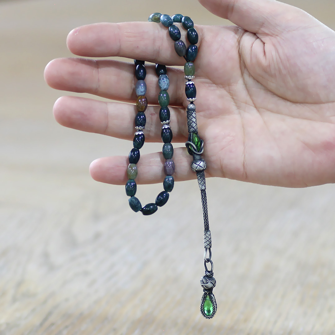 Doğaltaş Hint Akik Tesbih - 1000 Ayar Gümüş Kazaz Püsküllü - Çok Renkli - Arpa Kesim