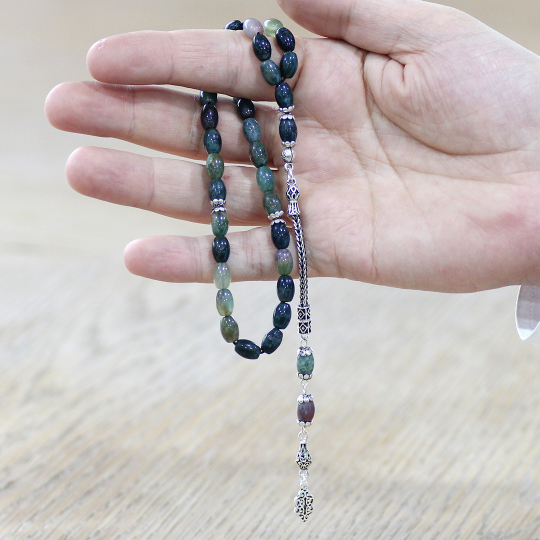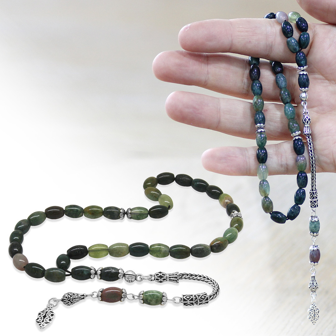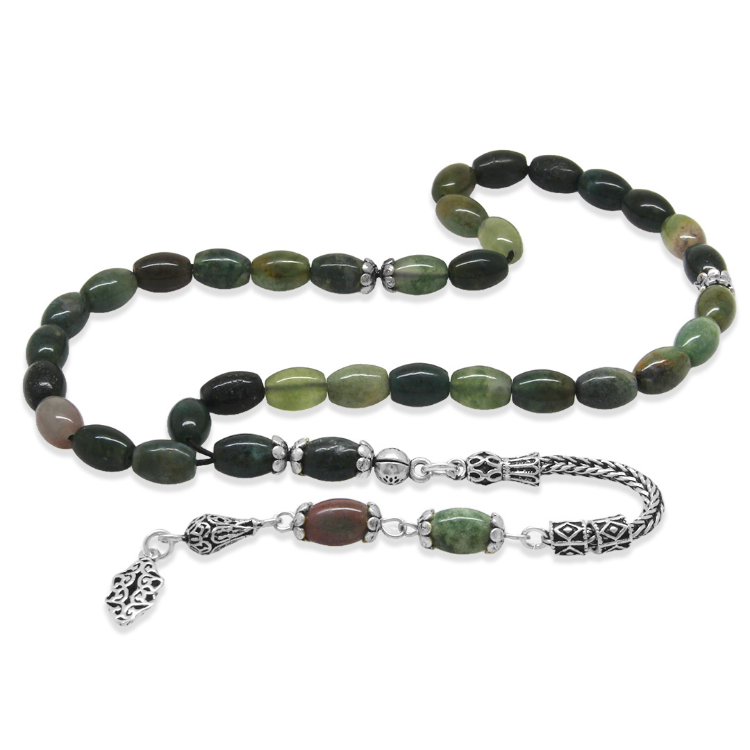 Doğaltaş Hint Akik Tesbih - 925 Ayar Gümüş Püsküllü - Çok Renkli - Arpa Kesim