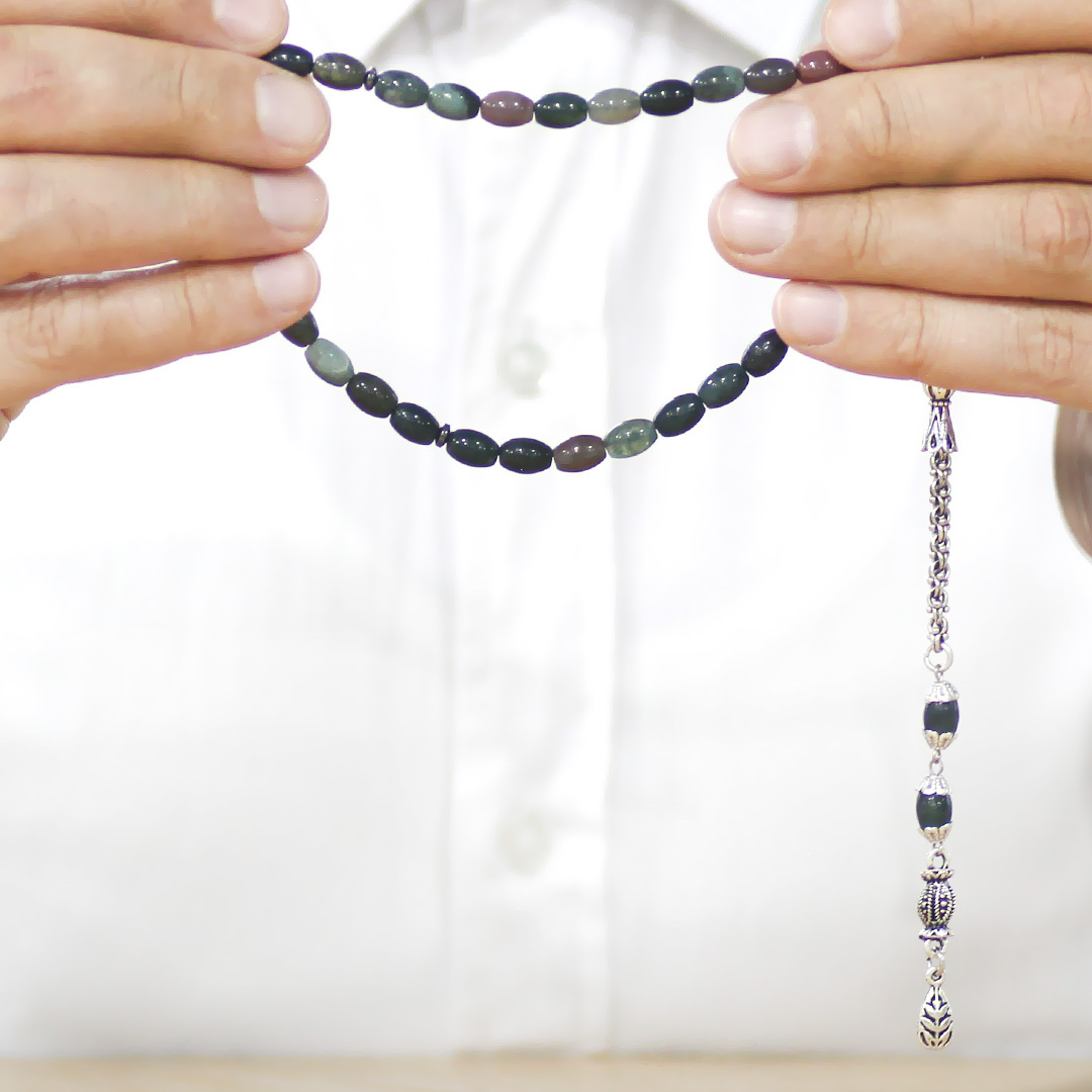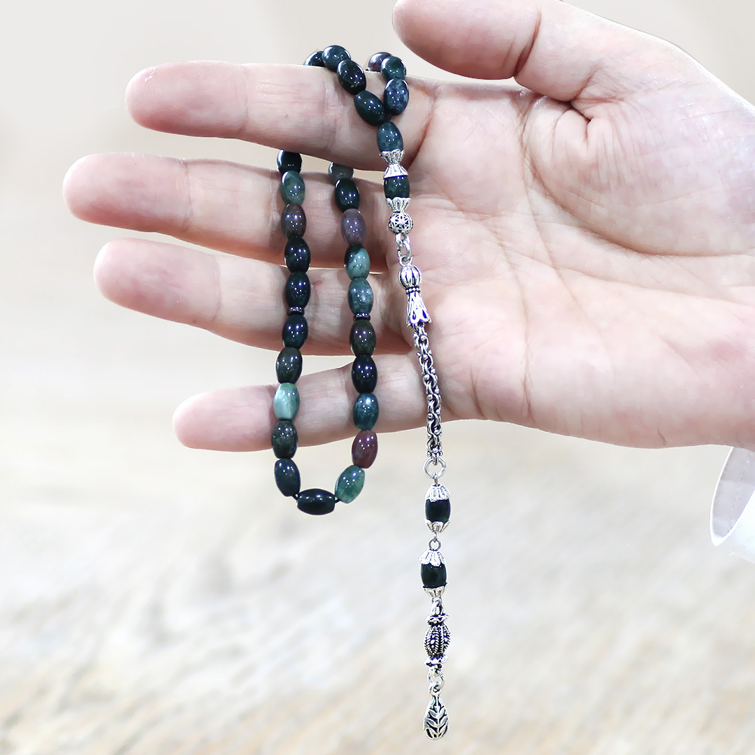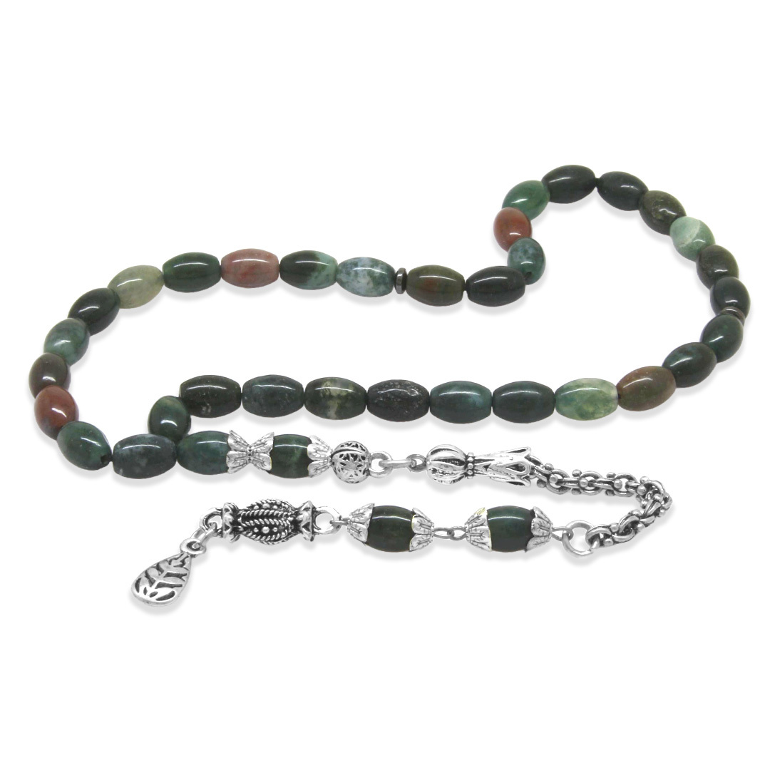 Doğaltaş Hint Akik Tesbih - Kararmaz Metal Arnavut Zincir Püsküllü - Çok Renkli - Arpa Kesim