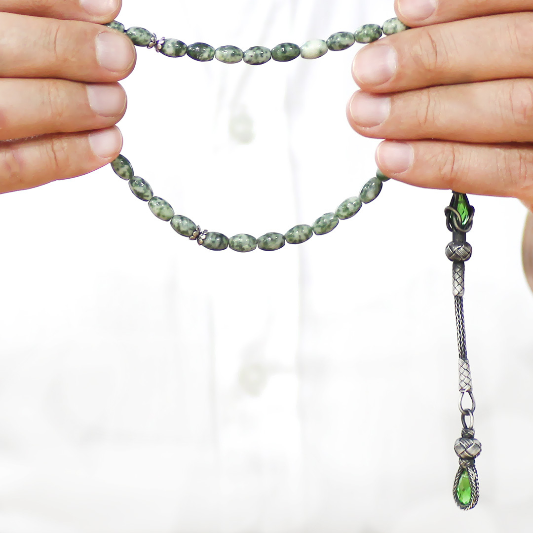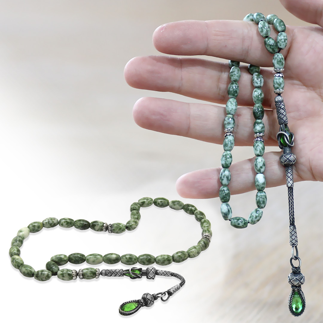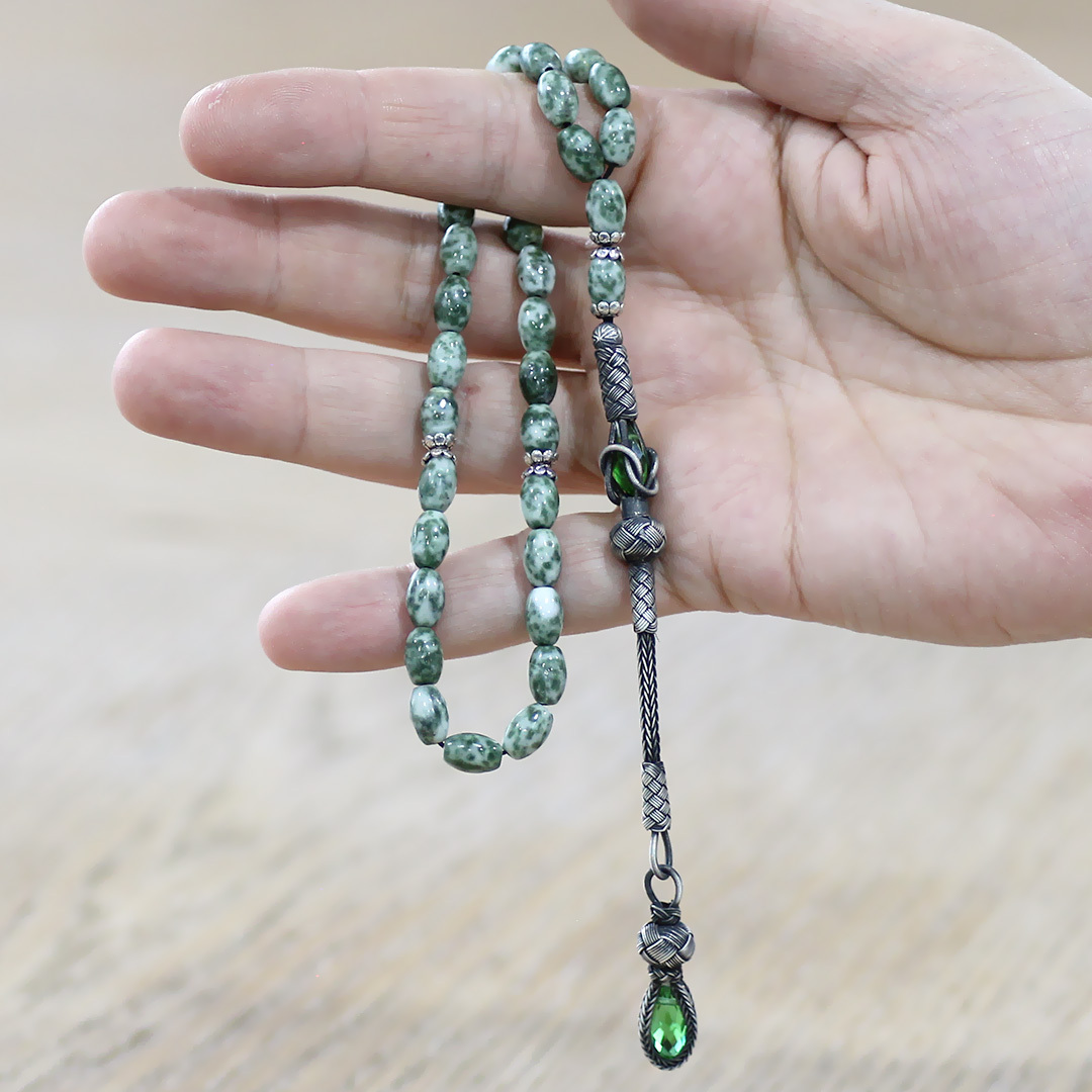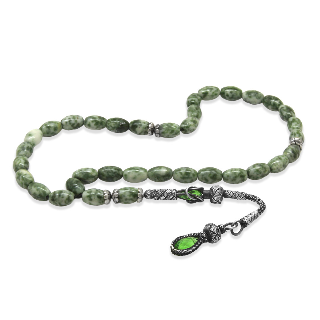 Doğaltaş Jasper Tesbih - 1000 Ayar Gümüş Kazaz Püsküllü - Çok Renkli - Arpa Kesim